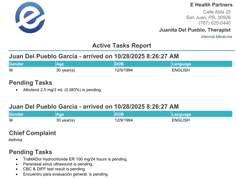 - Pending Tasks: Despliega el listado de las tareas clínicas del paciente.