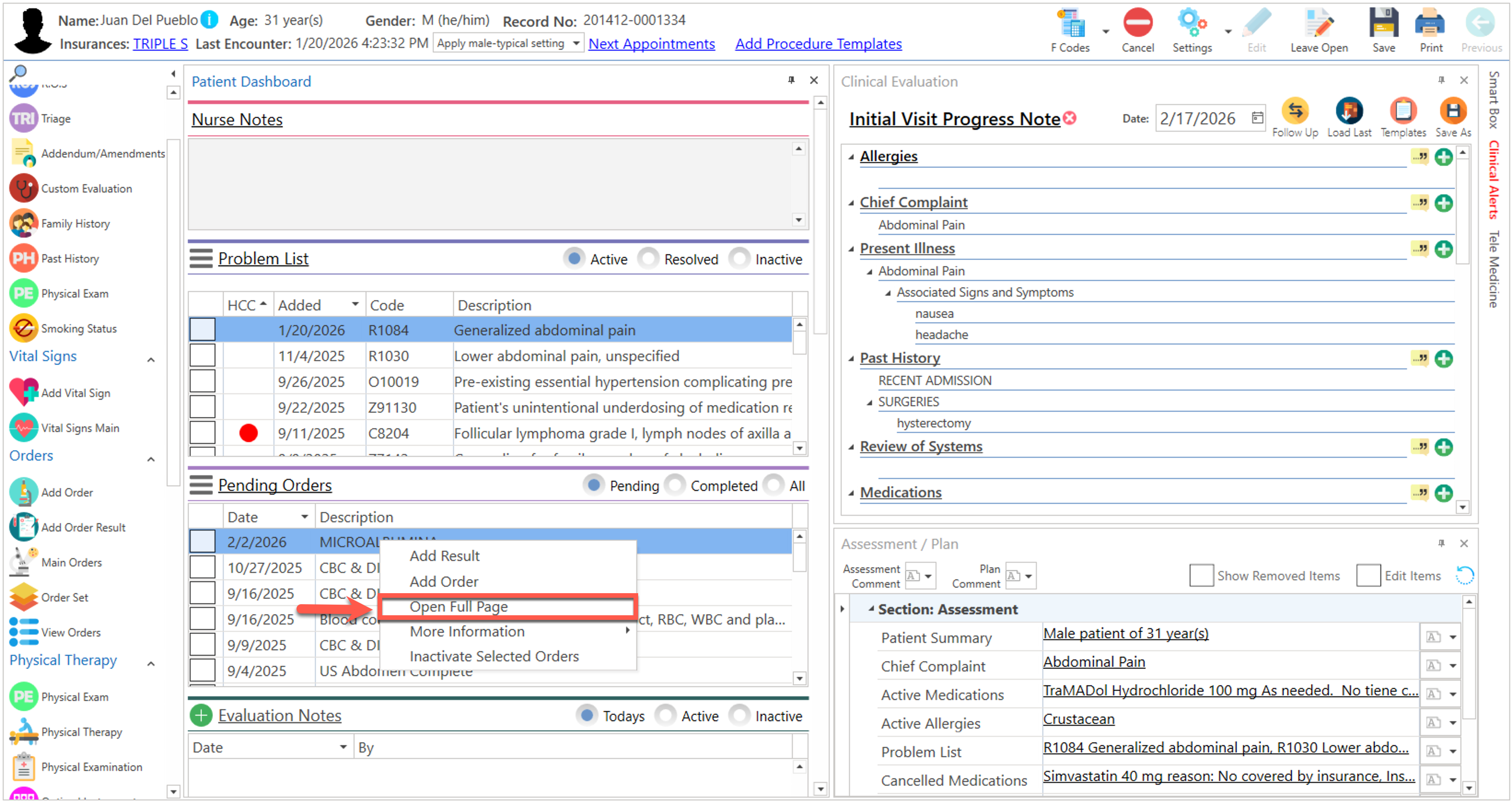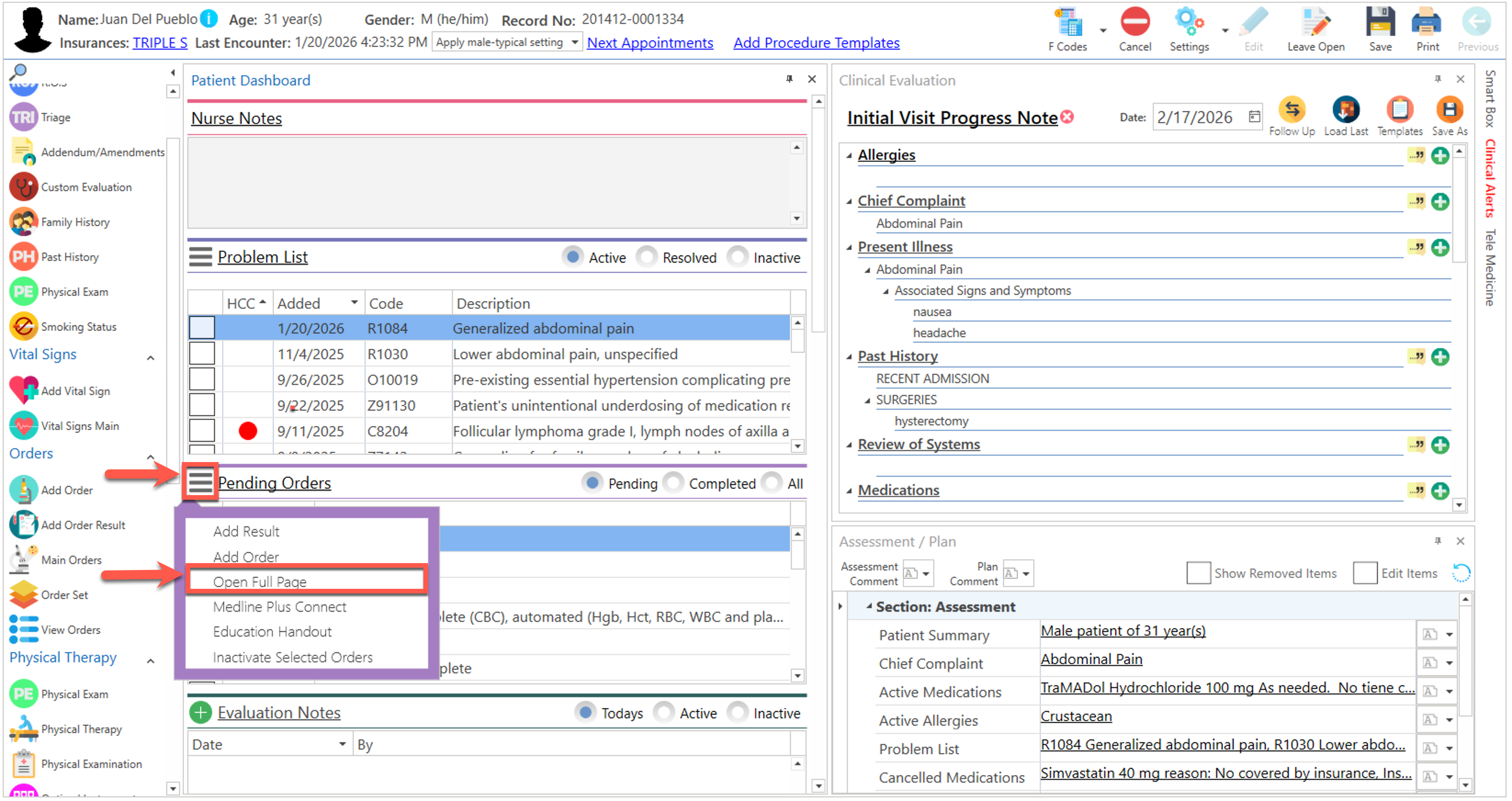 - Presione el botón de "More", localizado en la sección del "Patient Dashboard" y seleccione la opción de "Open Full Page".