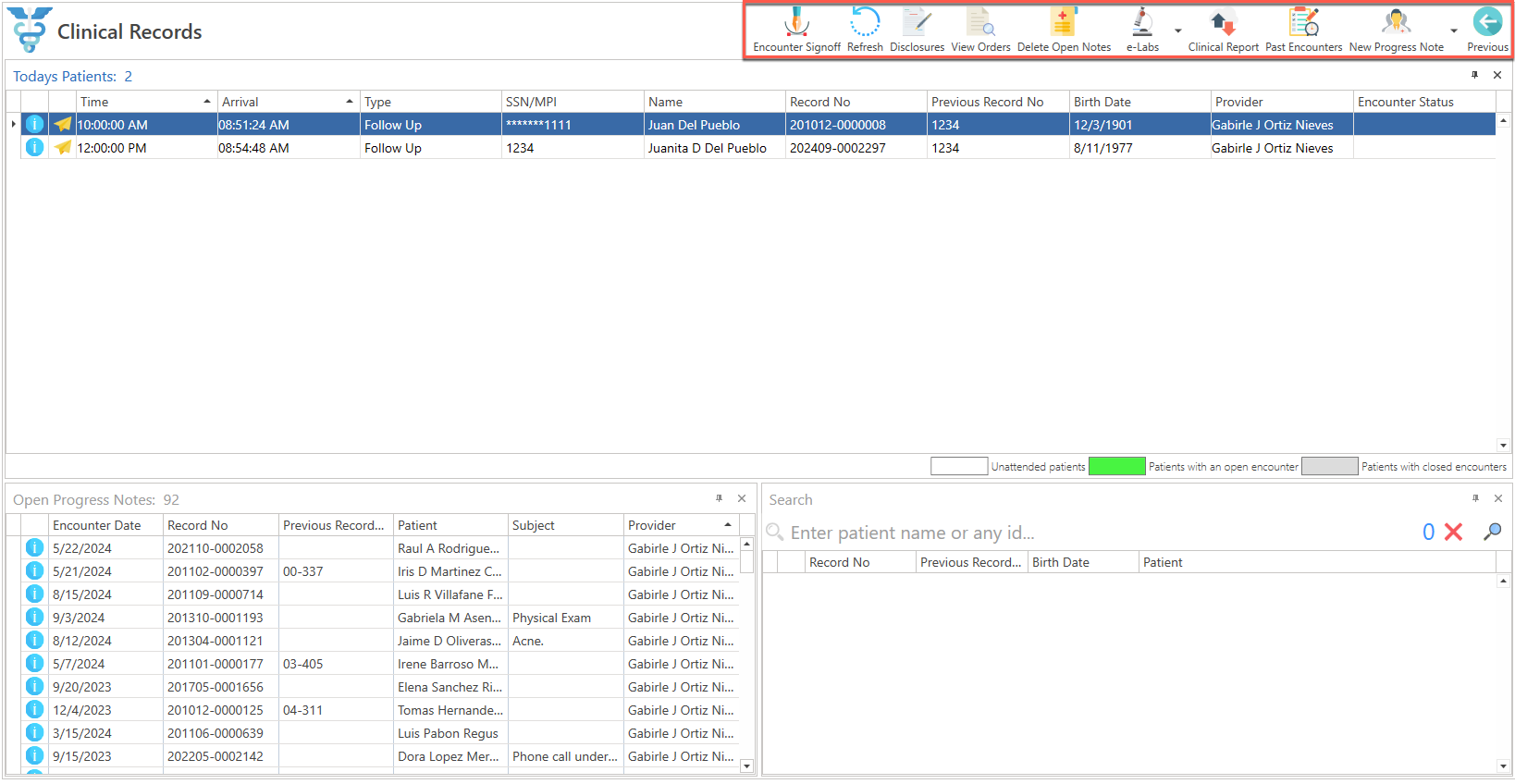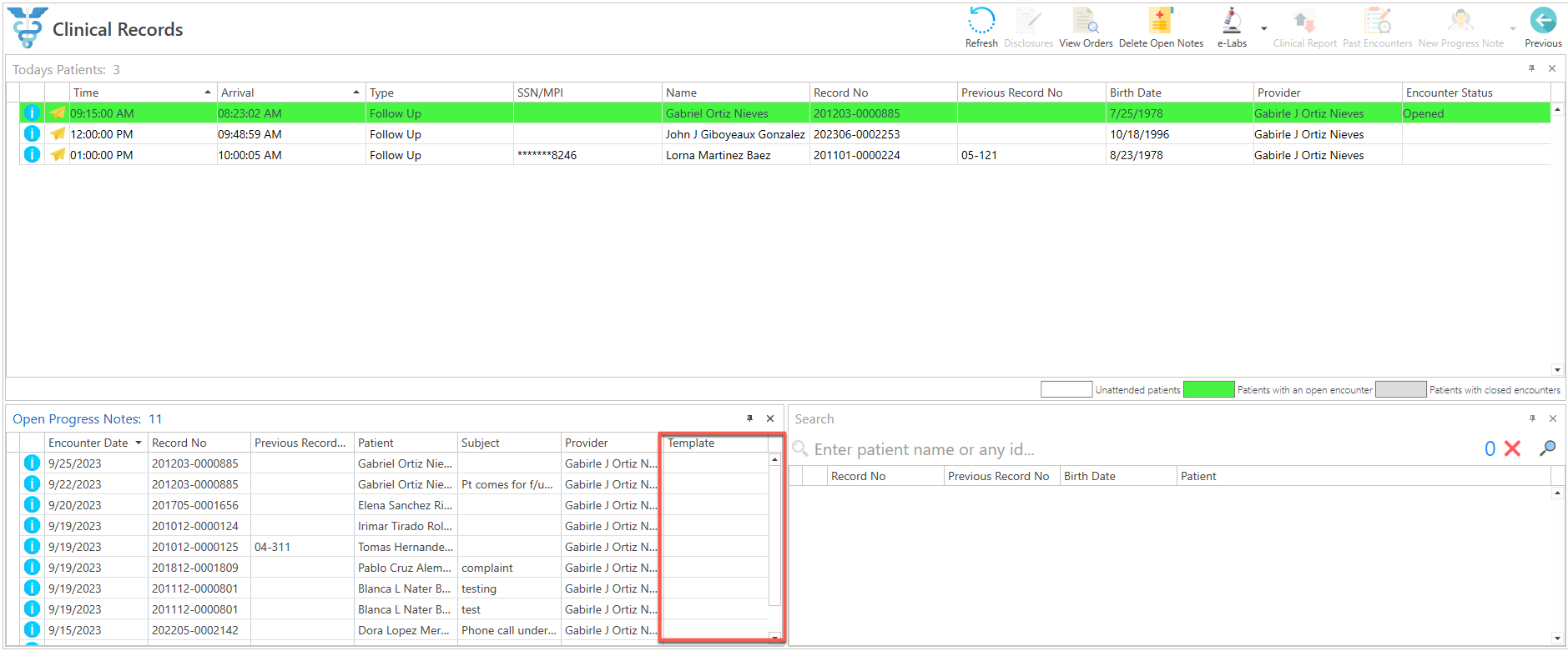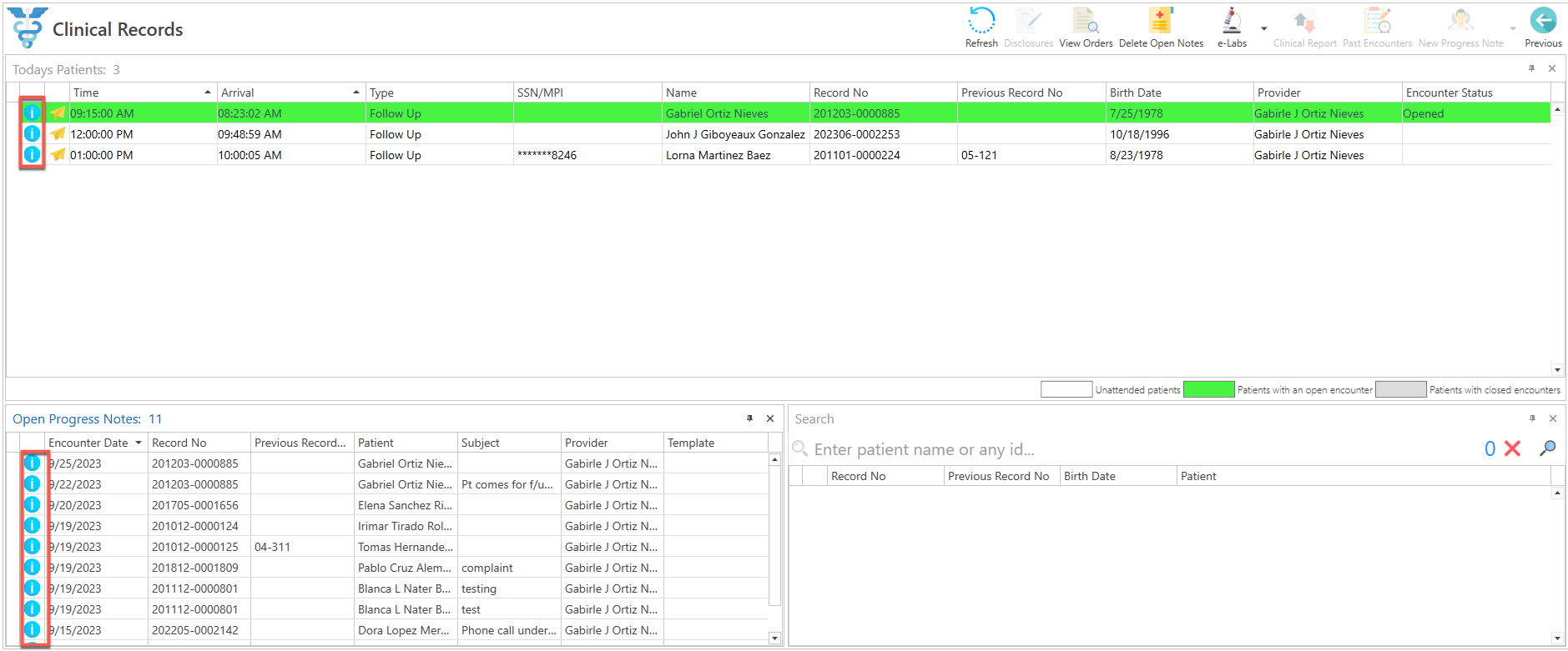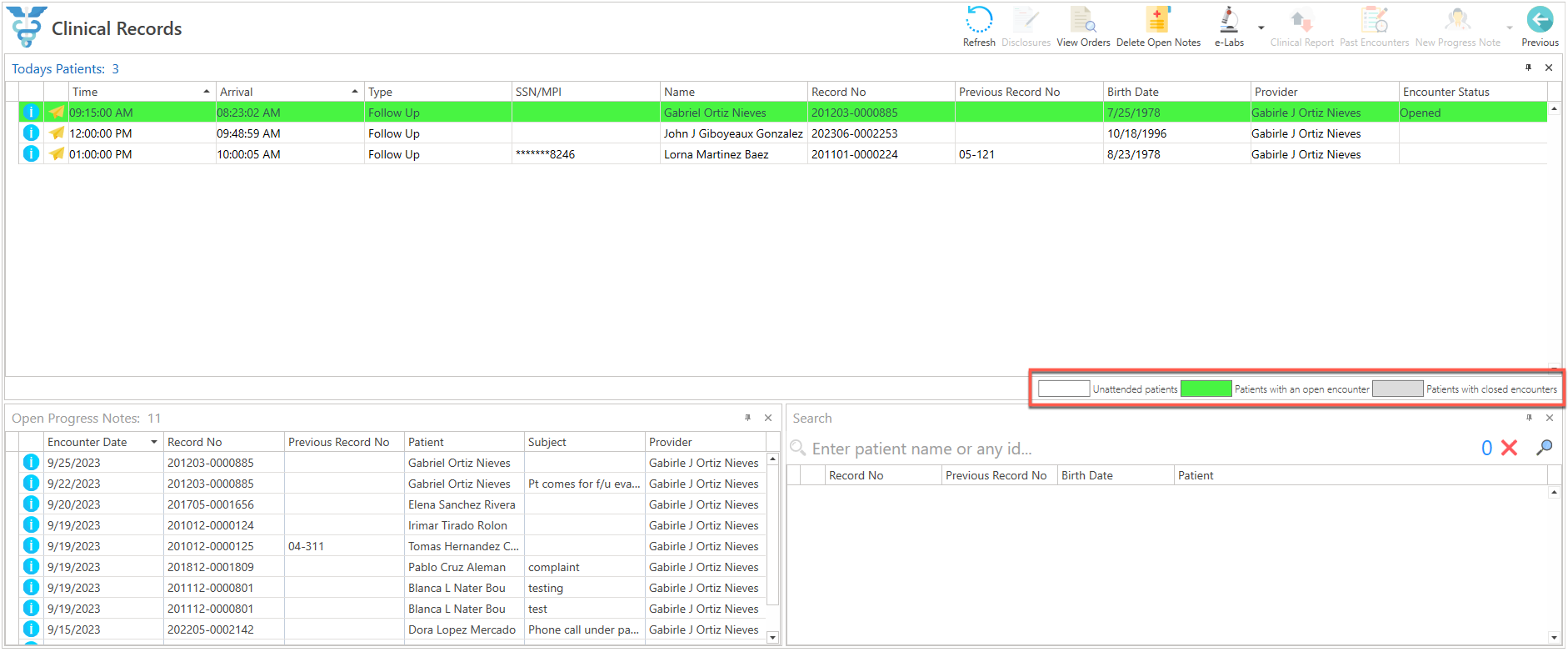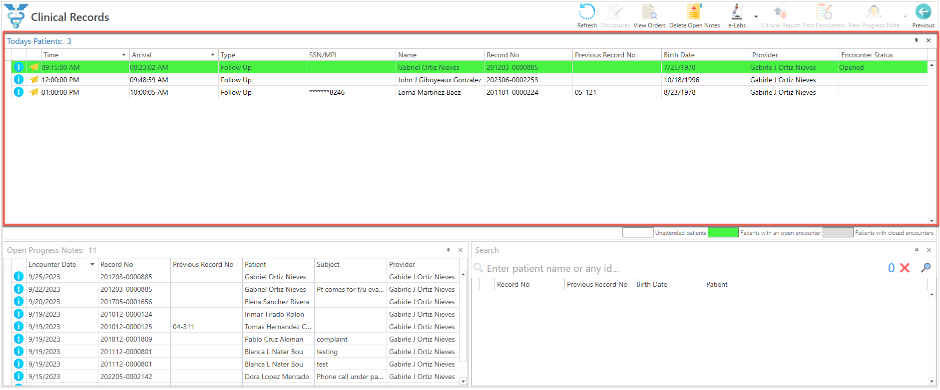 - Patients with an open encounter: Si el paciente, en la sección de "Todays Patients", está identificado con el color verde, significa que la nota de progreso está abierta.