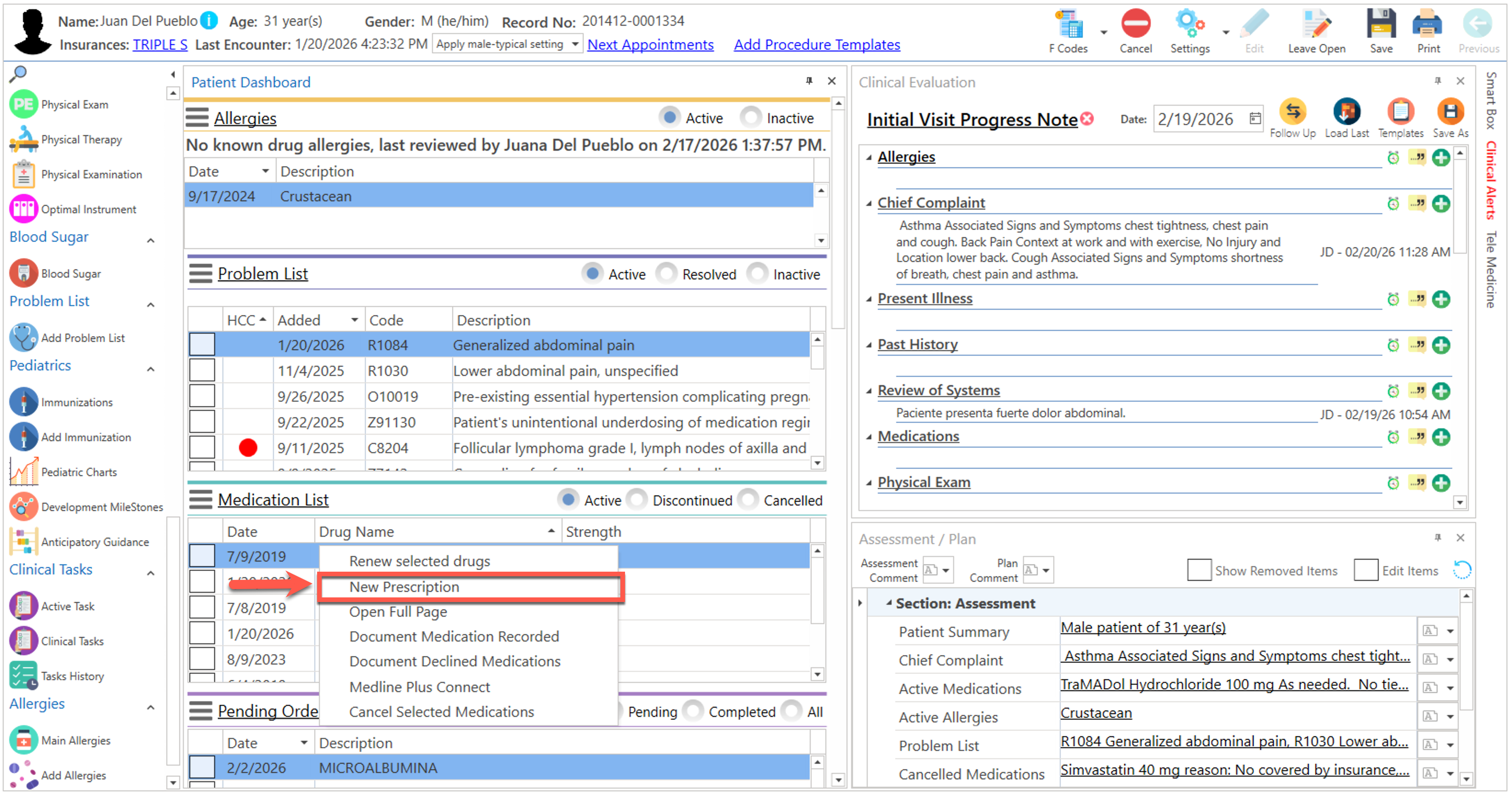 - Presione el botón derecho del "mouse", en la sección del "Patient Dashboard" y seleccione la opción de "New Prescription".