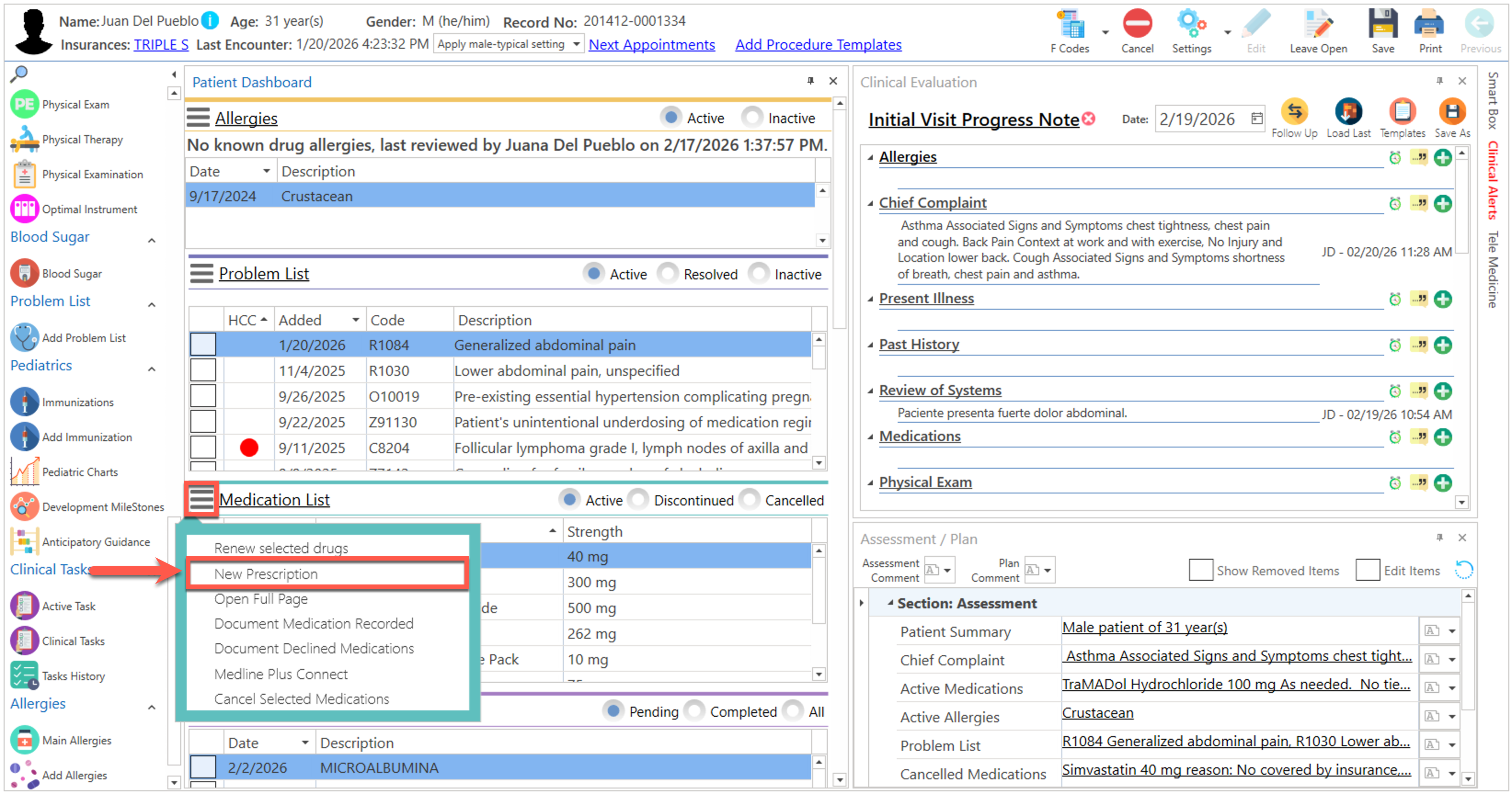 - Presione el botón derecho del "mouse", en la sección del "Patient Dashboard" y seleccione la opción de "New Prescription".