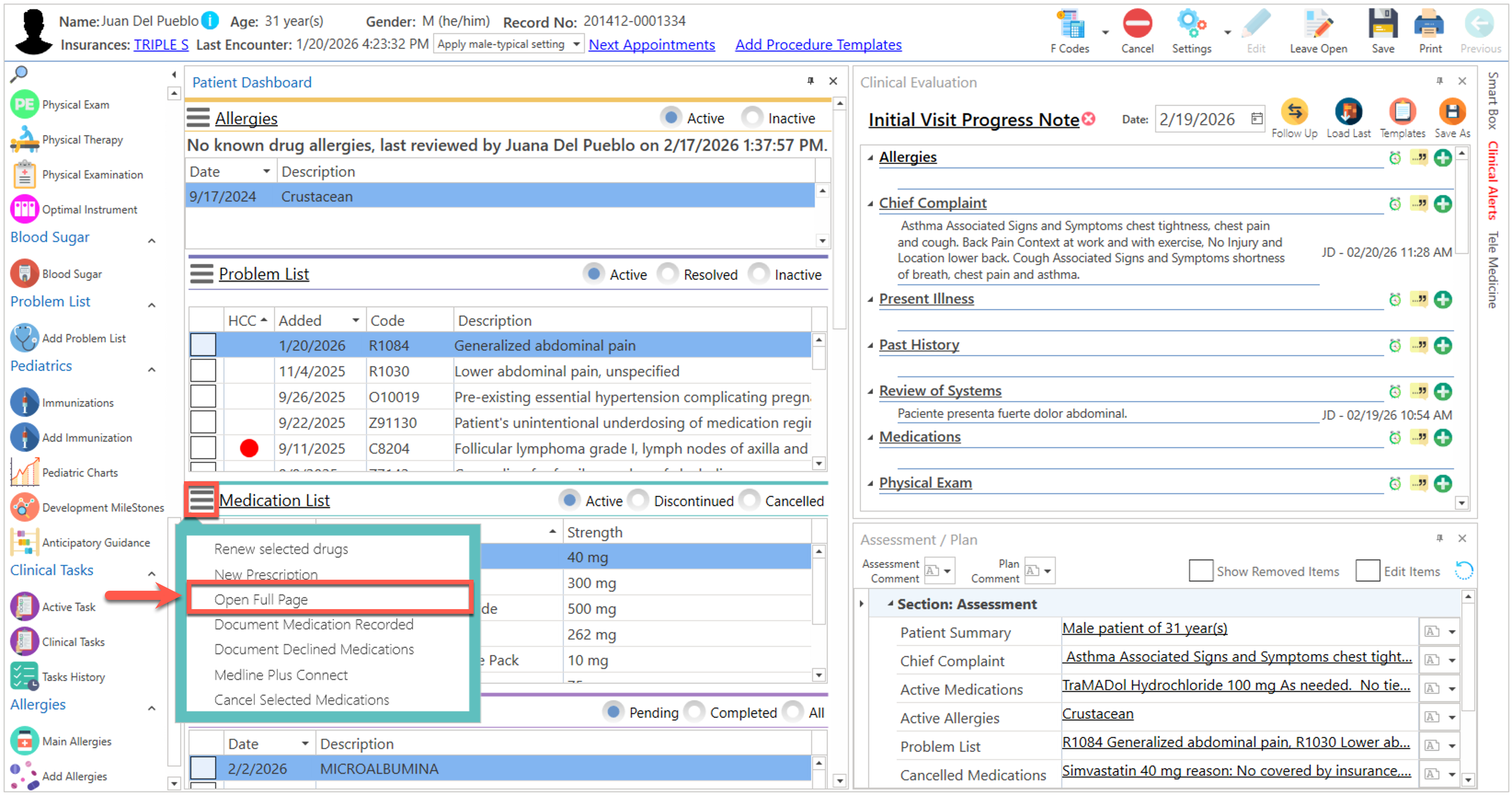 • Presione el botón de "More", localizado al lado del texto de Medications List" y seleccione la opción de "Open Full Page".