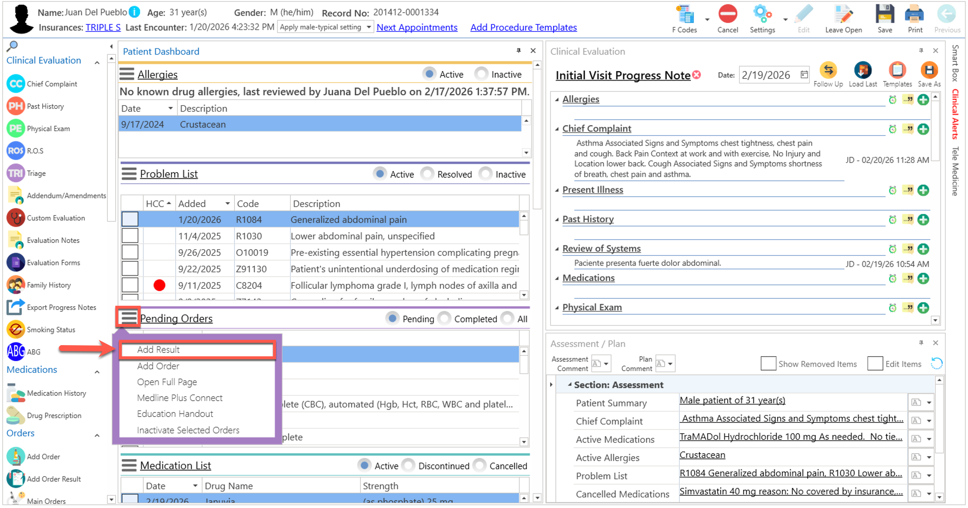 - Si el paciente tiene una orden pendiente, seleccione la misma y presione el botón de "More", localizado al lado del enlace de "Pending Orders" y seleccione la opción de "Add Results".