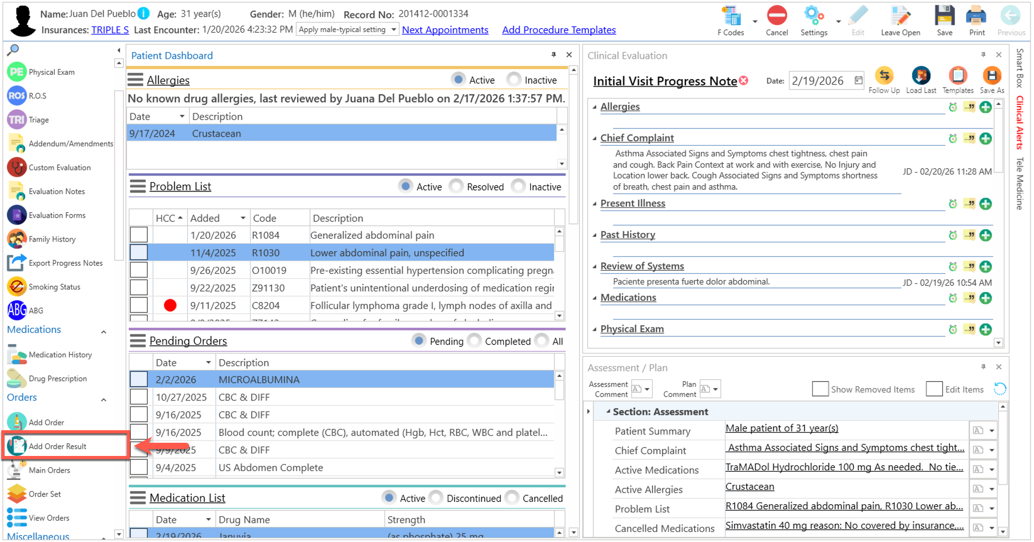 - Si el paciente no tiene órdenes pendiente, presione el botón de "Add Order Result", localizado en la parte superior de la pantalla.
