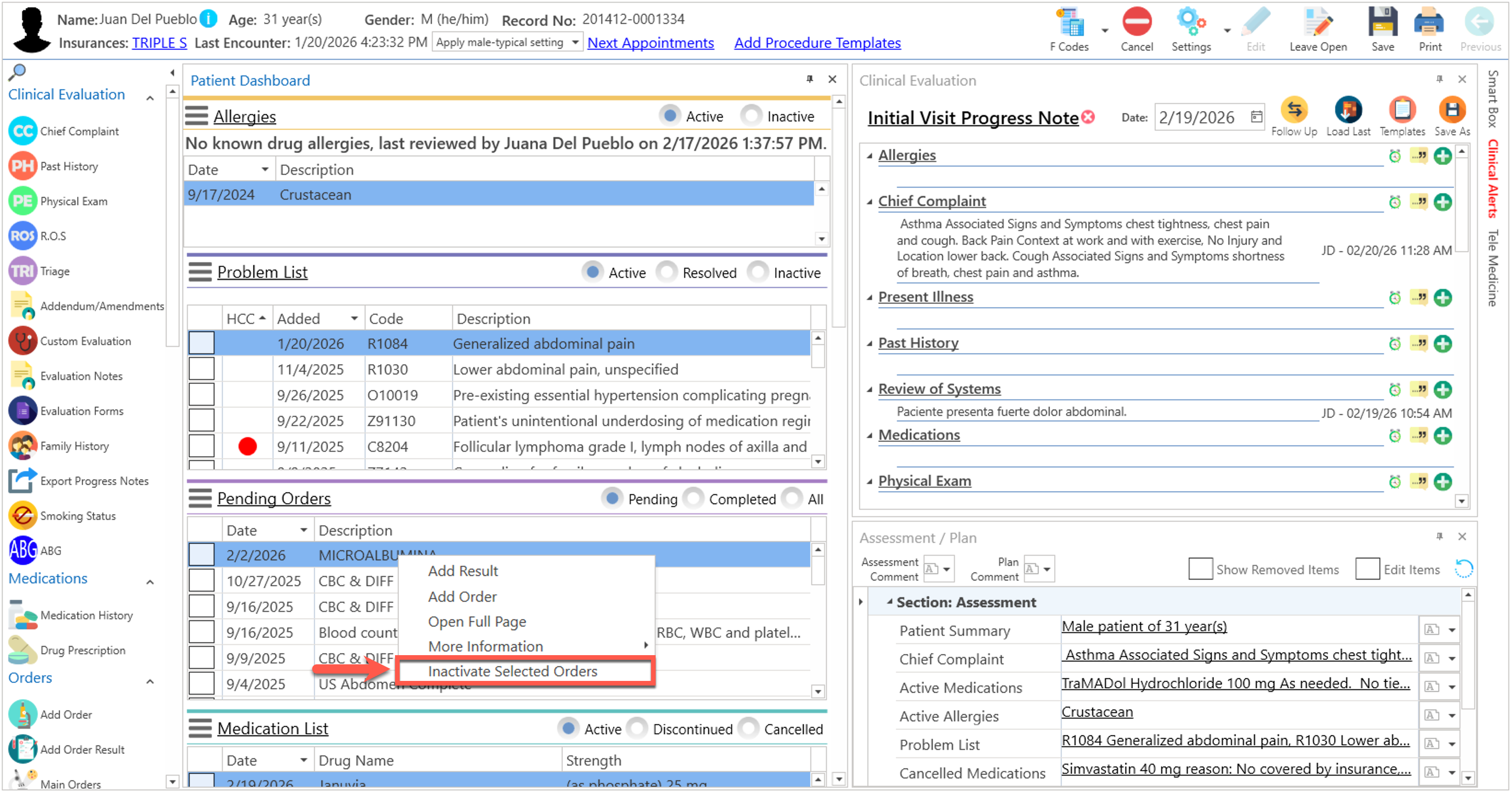 - Seleccione la orden pendiente que desea eliminar, en la sección de "Pending Orders", localizado en el "Patient Dashboard".