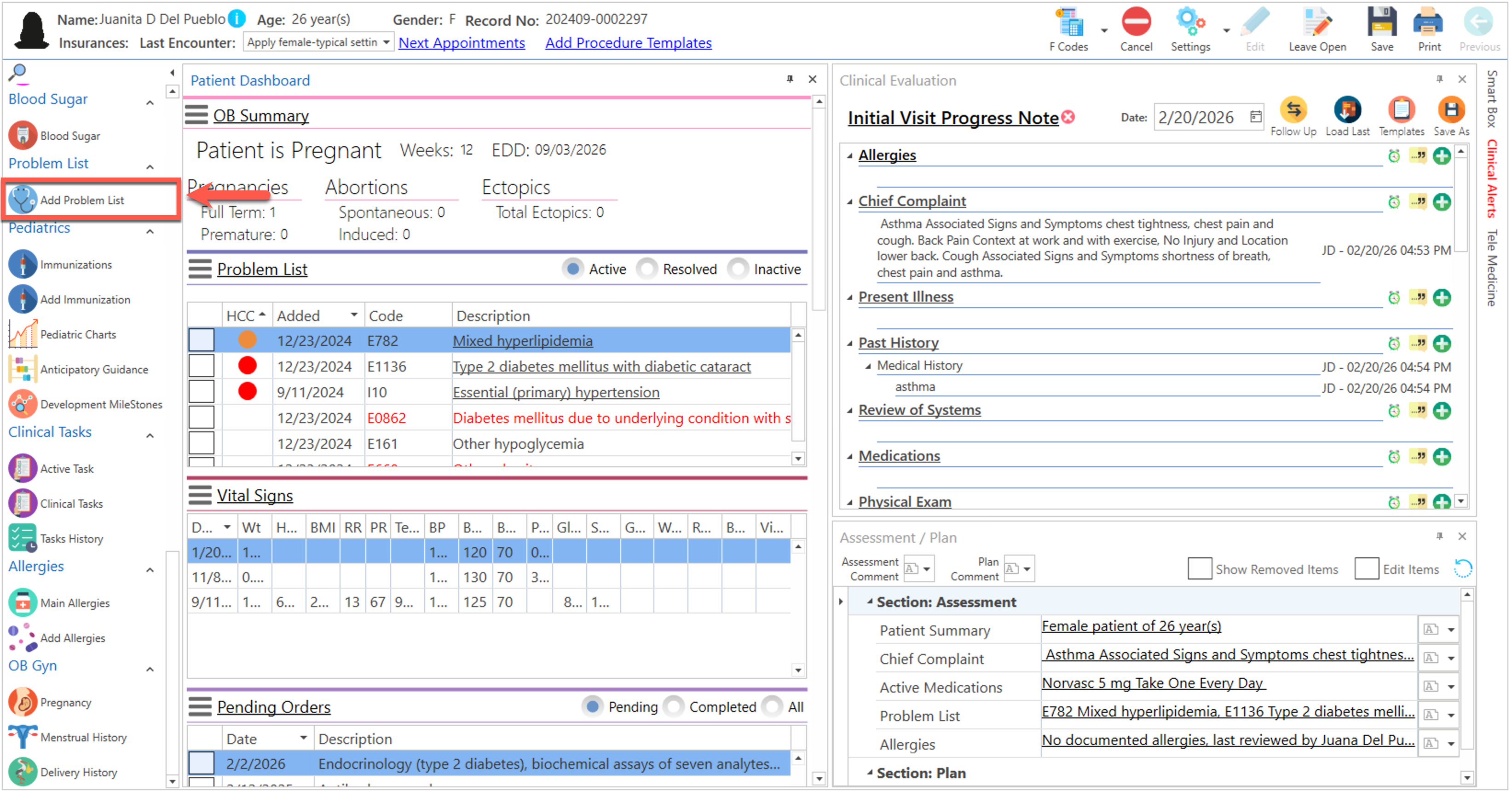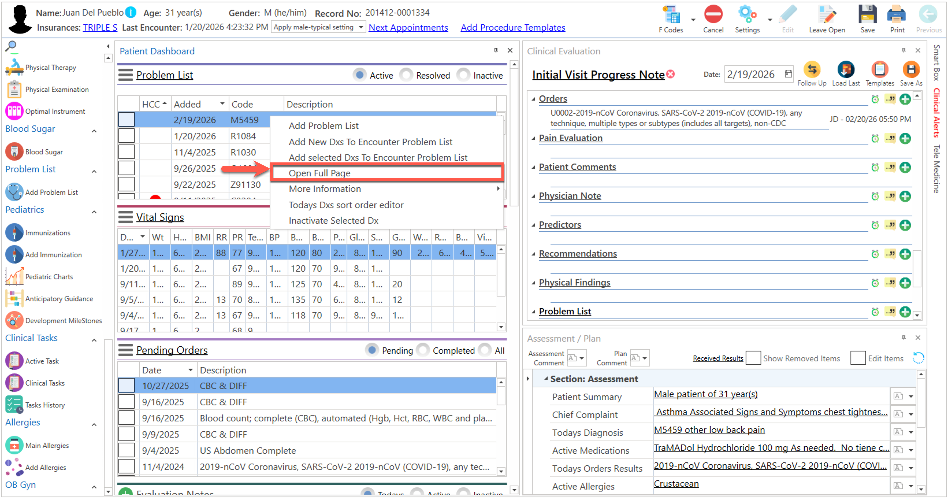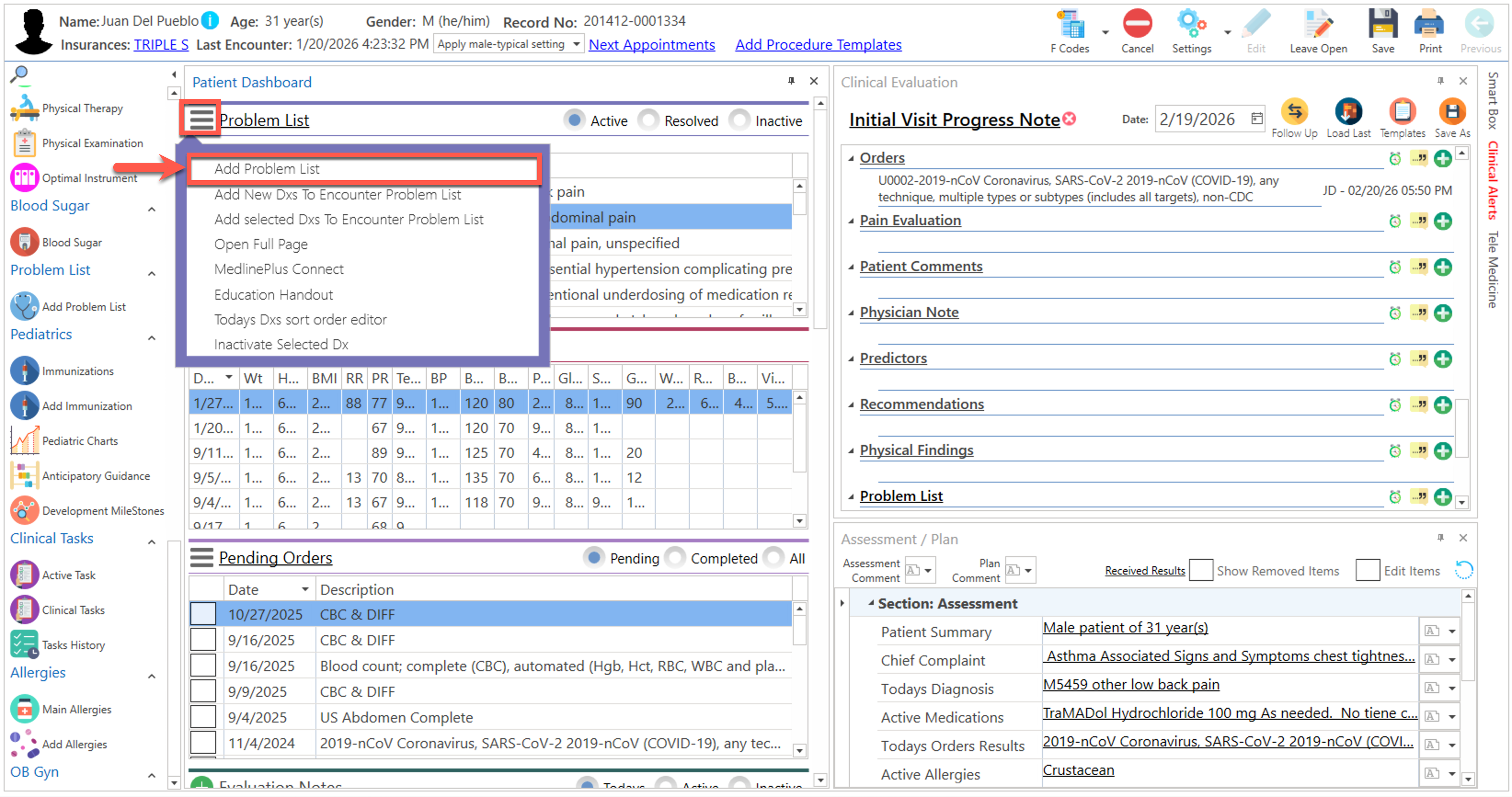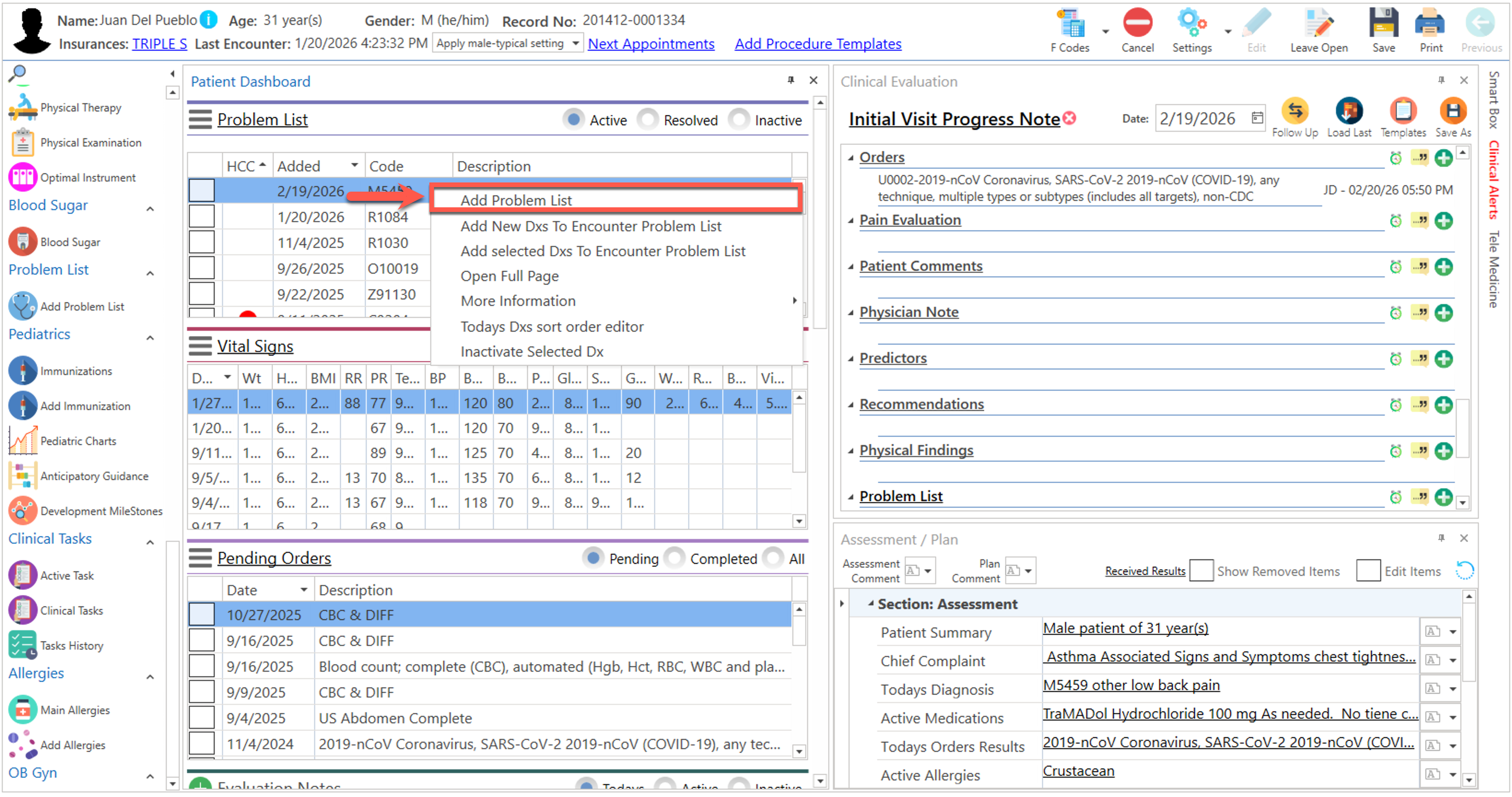 - Automáticamente, se desplegará en la sección de "Clinical Evaluation", si el "Template" seleccionado, tiene la opción de "Problem List".