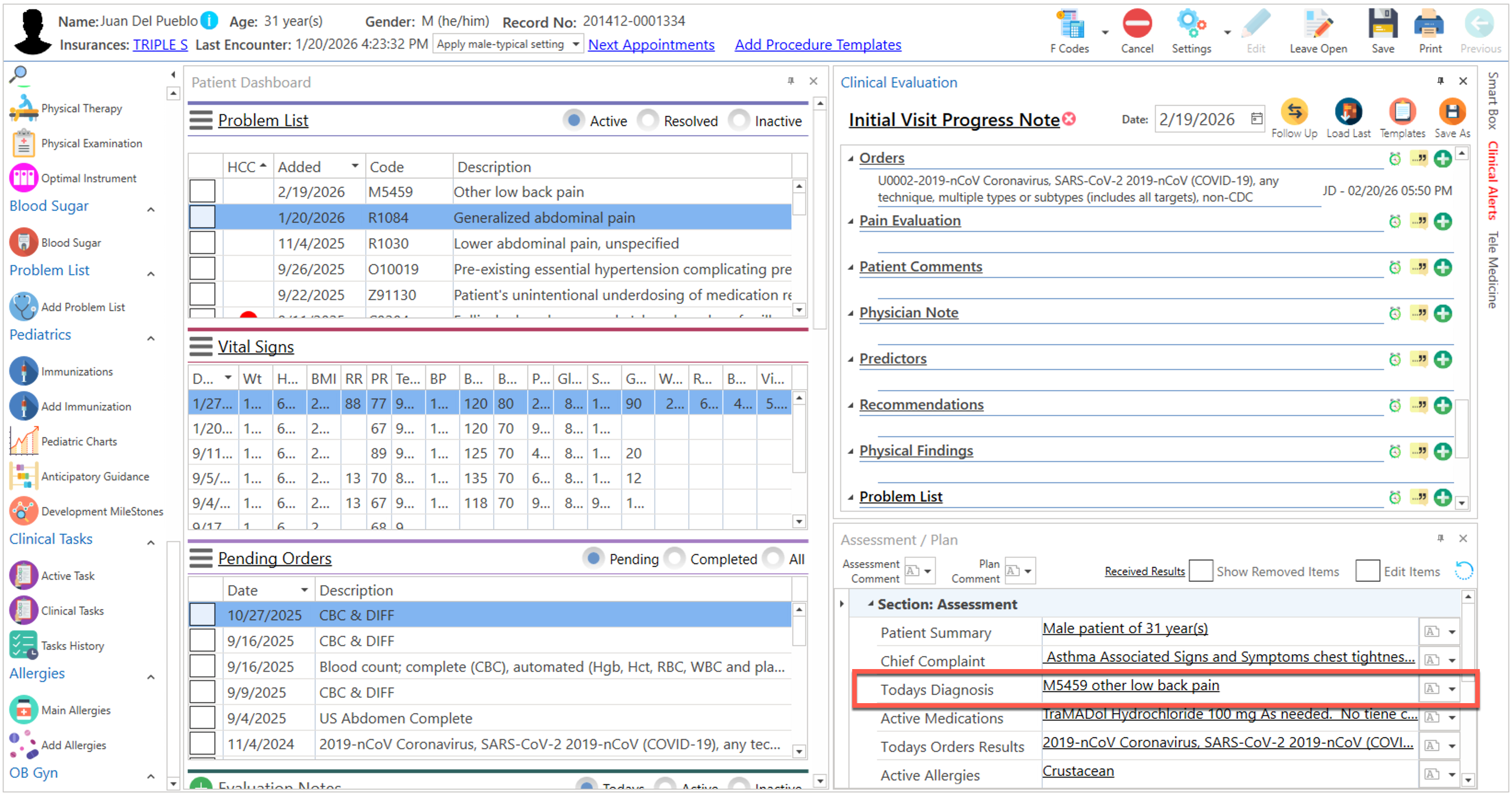 - De igual manera, pasará a la sección de "Assessment y Plan", bajo la categoría de "Todays Diagnosis".