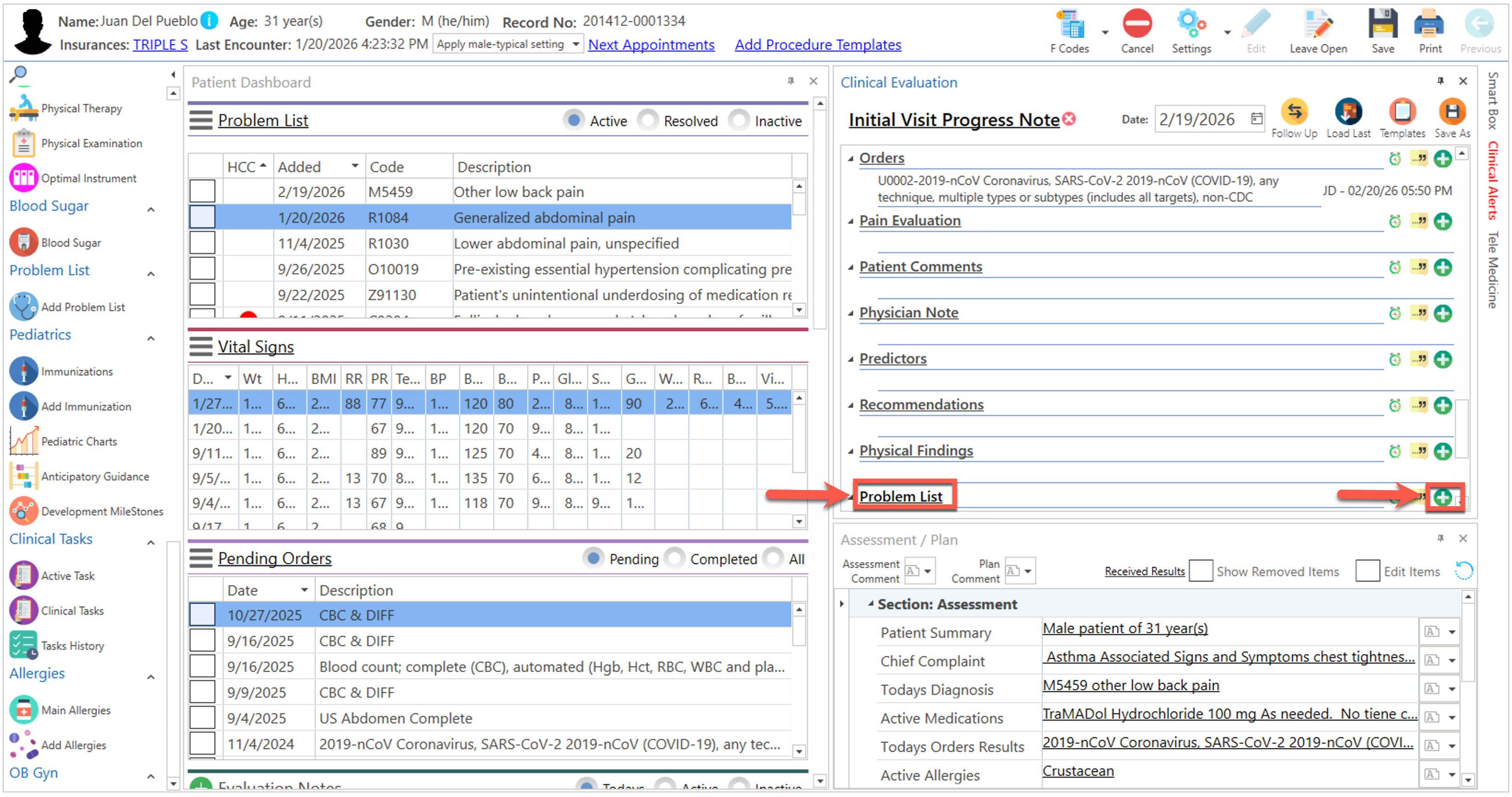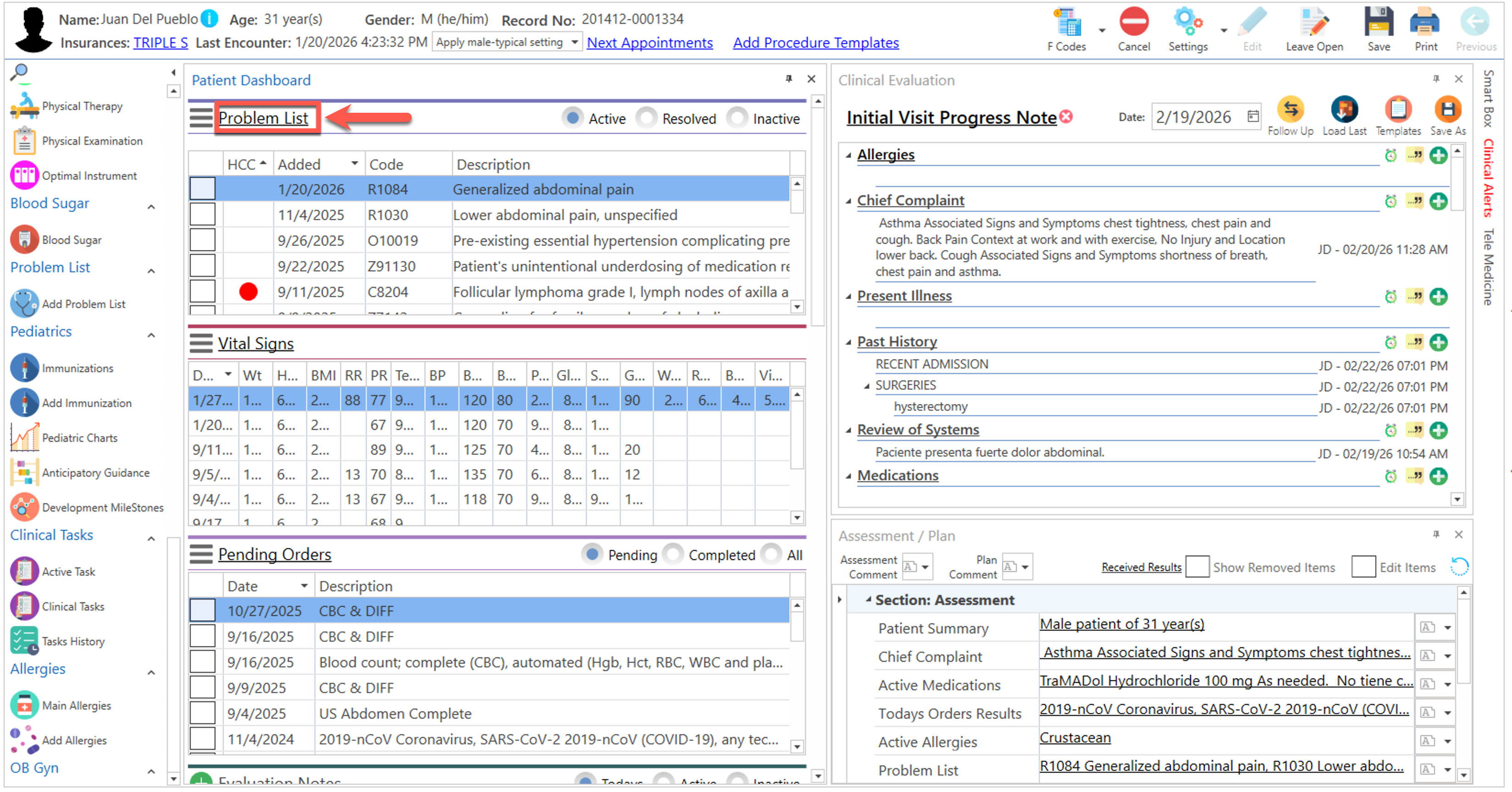 - Presione el texto de "Problem List", localizado en la sección del "Patient Dashboard".