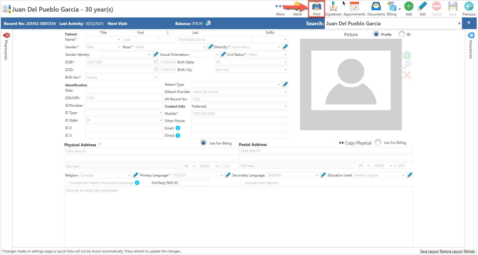 Existen varias opciones, para imprimir el reporte demográfico del paciente.