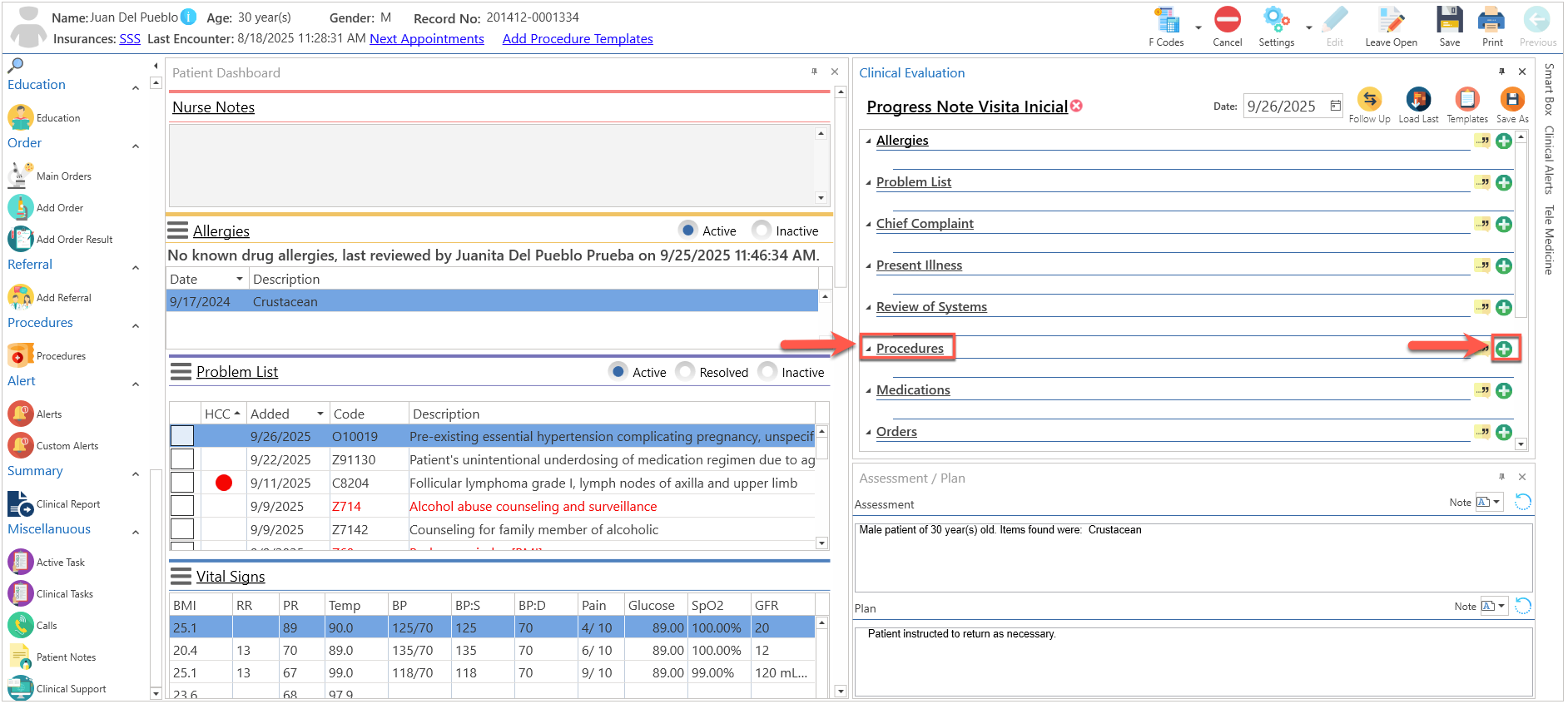 - Presione sobre el enlace de "Procedures", en la sección de "Clinical Evaluation". O presione el botón de "Add" localizado en dicha sección. (Debe estar configurado, en la pantalla de "Progress Notes Templates Settings".)