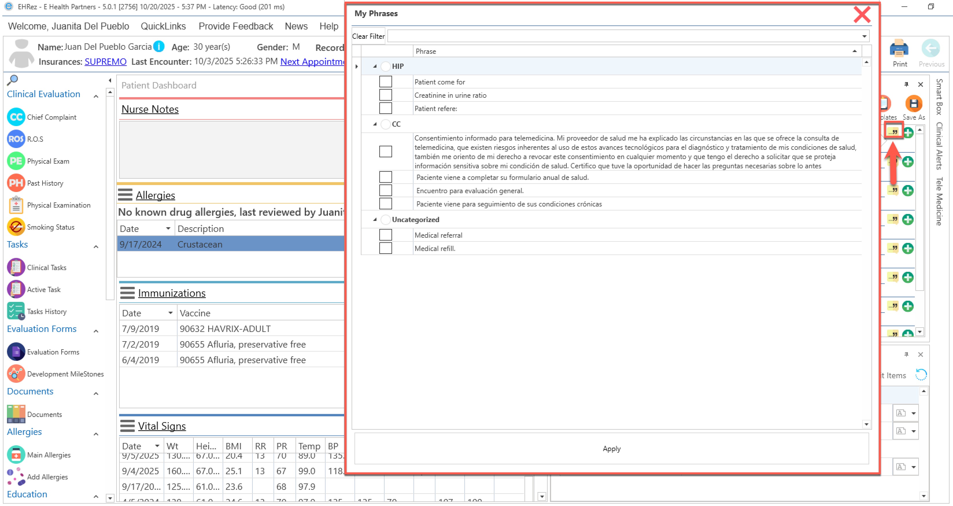 - Conociendo el área de: Advanced Progress Note / Settings / Phrases Settings