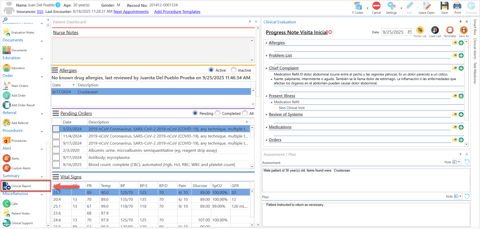 - Presione el botón de "Clinical Report", localizado en la sección del "Side Bar".