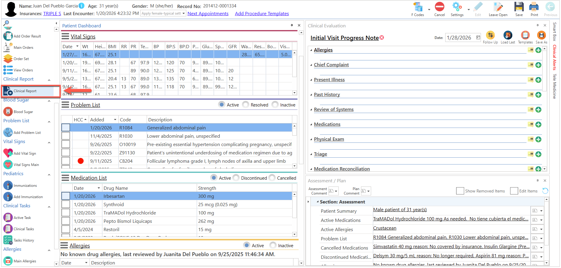 - En la nota de progreso, presione el botón de "Clinical Report", localizado en la sección del "Side Bar", o en la sección de "Search", localizado en la parte superior izquierda de la pantalla.