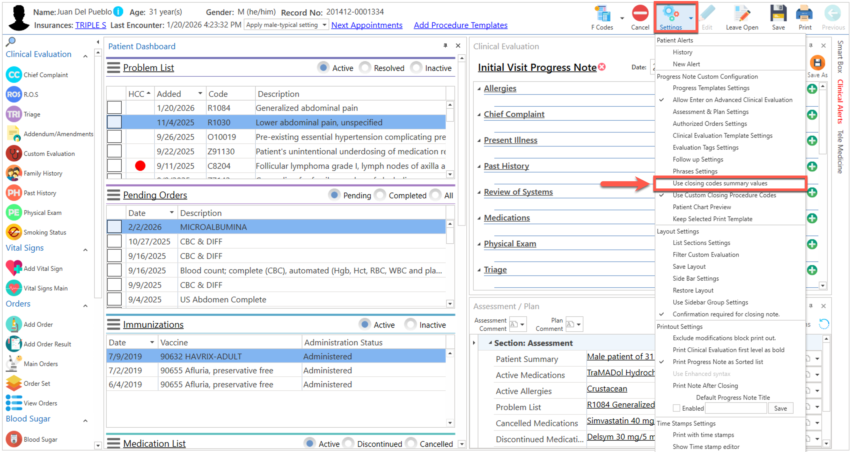 Esta configuración, permite al usuario seleccionar el despliegue de los códigos de procedimientos personalizados, al momento de cerrar una nota de progreso. (Antes, debe configurar los mismos, en la pantalla de "Settings/ Clinical / Closing Procedure Settings".)