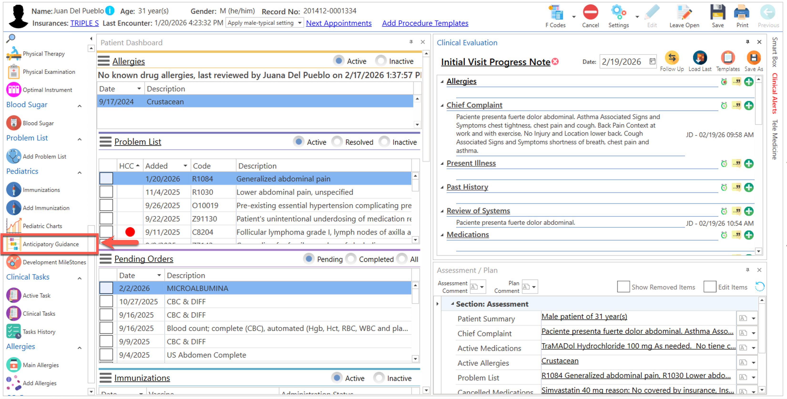 "Search", localizado en la parte superior izquierda de la pantalla y seleccione la opción de "Anticipatory Guidance". - Se desplegará la siguiente pantalla: