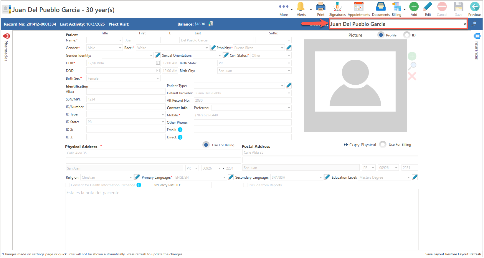 - En el campo de "Search", ingrese el nombre, apellido, número de récord o, algún número de récord alterno.