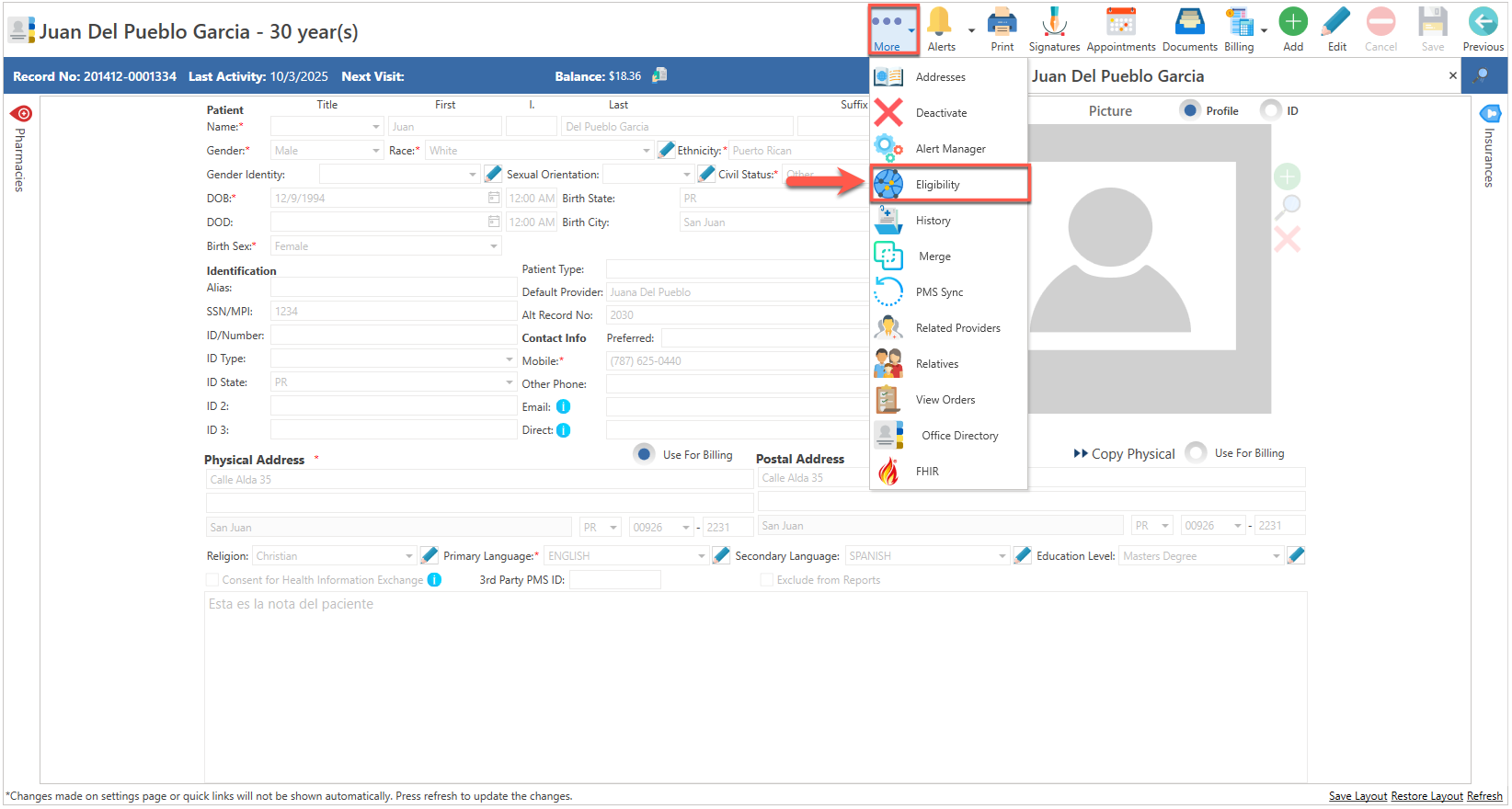 - Si desea ver el detalle de las elegibilidad del plan médico del paciente, presione el botón de "More", localizado en la parte superior de la pantalla y luego, seleccione la opción de "Eligibility".