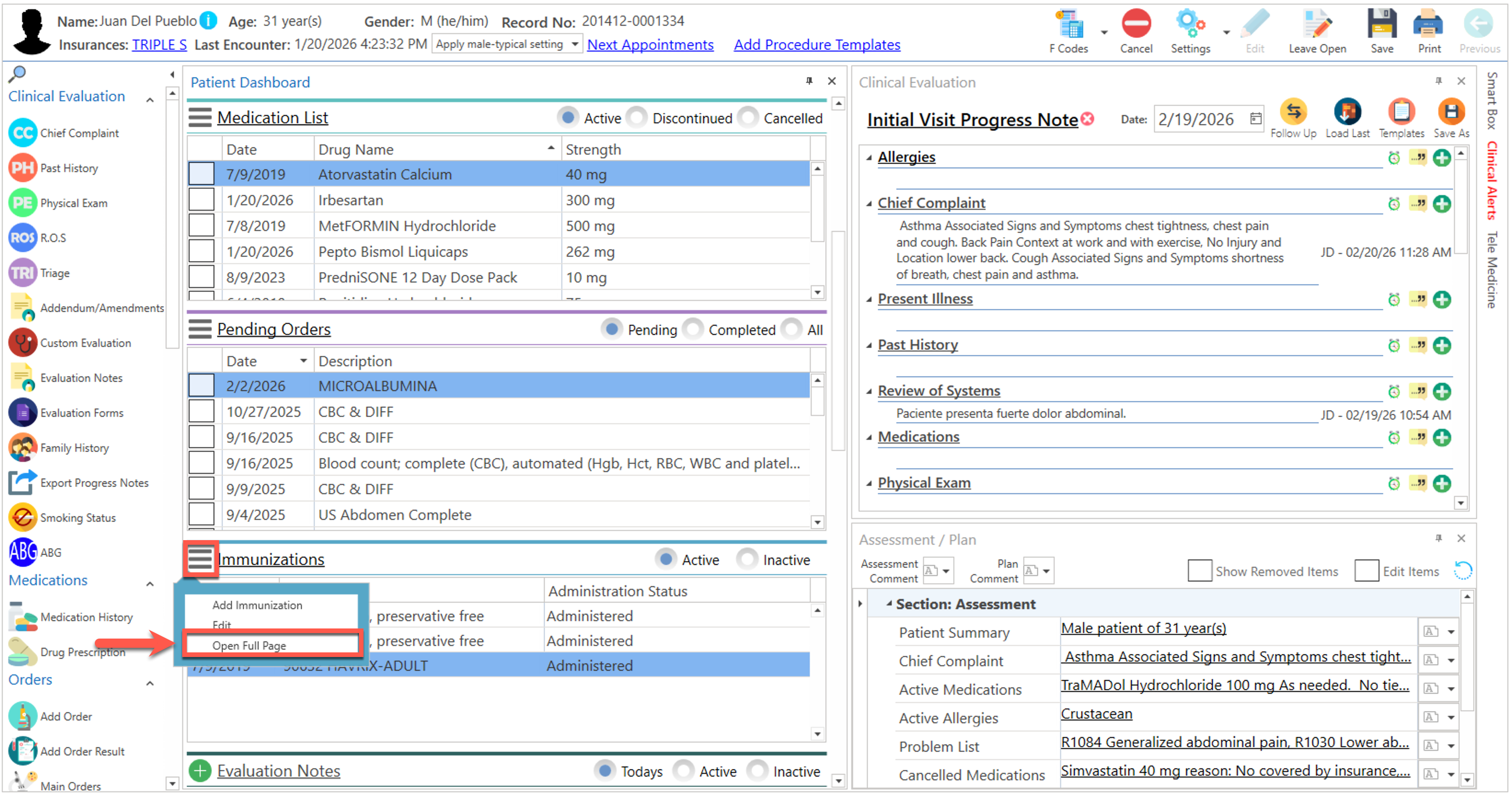 - Presione el botón de "Add", localizado en la sección de "Immunizations", en el panel del "Patient Dashboard" y seleccione la opción de "Open Full Page".