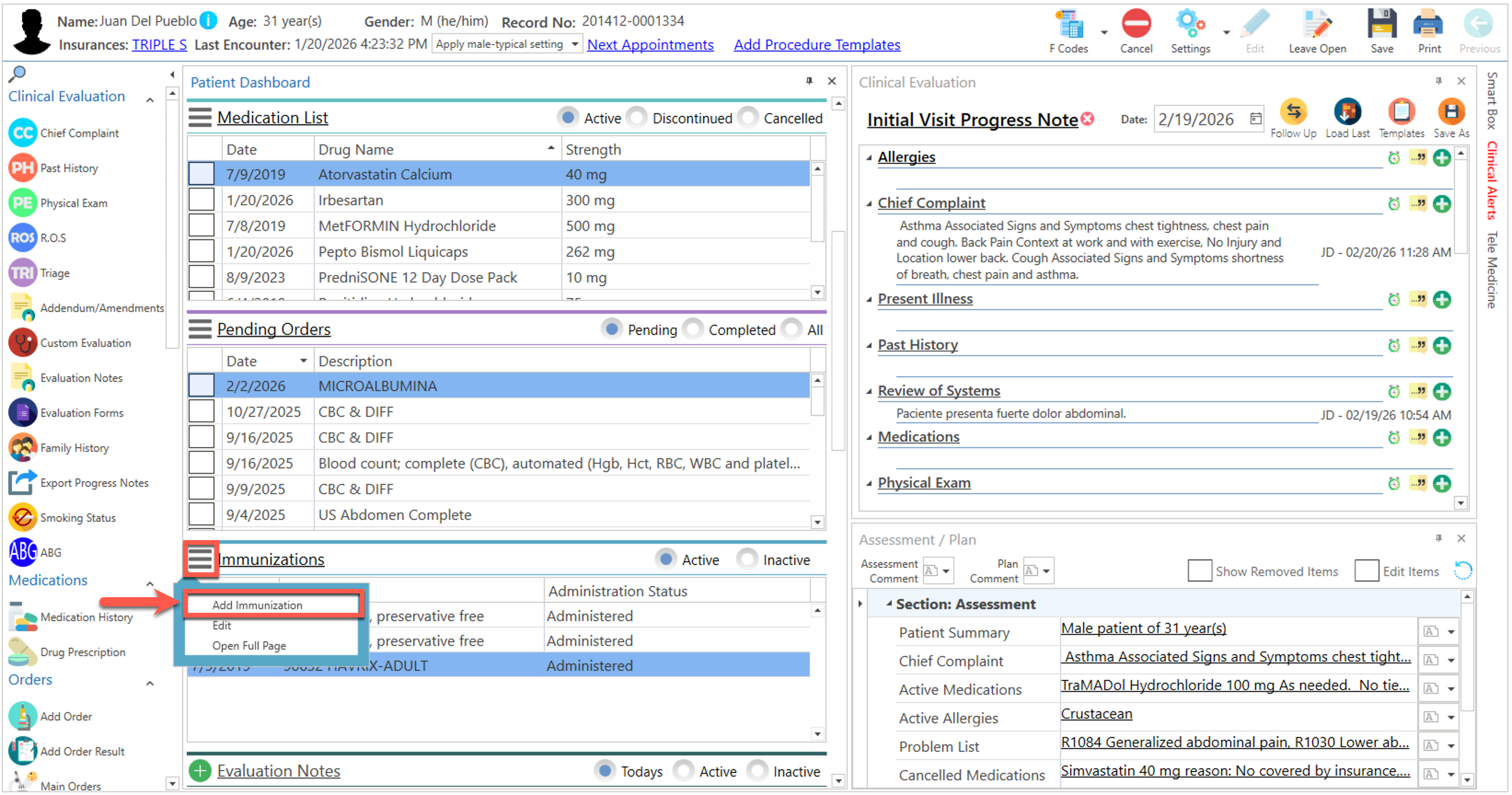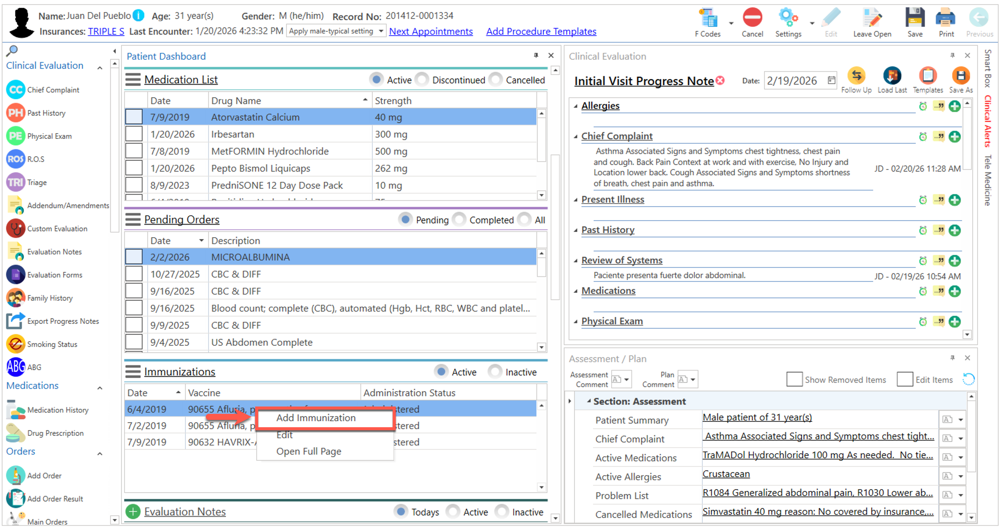 - O presione el botón derecho del "mouse" y seleccione la opción de "Add Immunization".