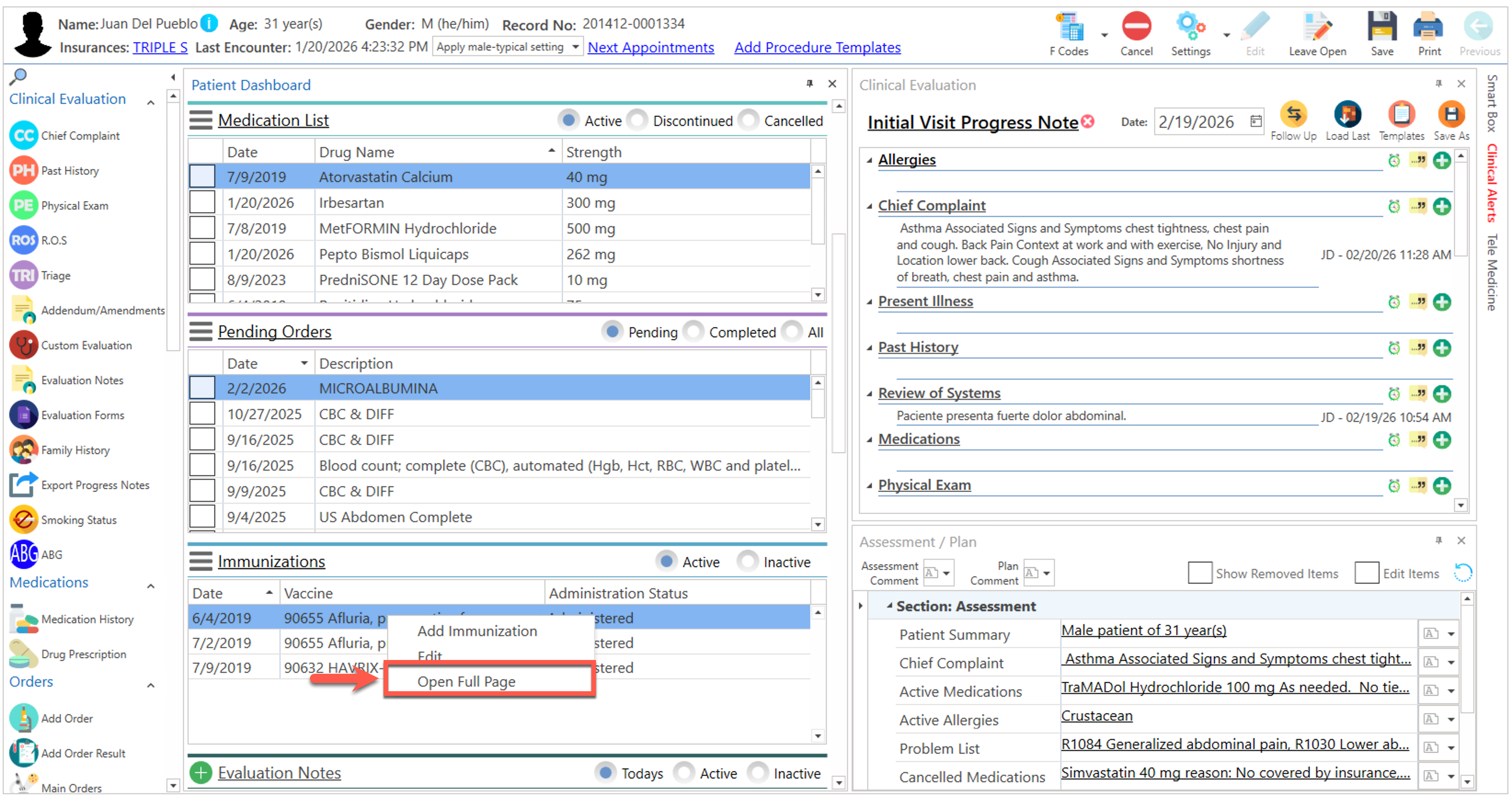 - Presione el botón de "More", localizado al lado del enlace de "Immunizations" y seleccione la opción de "Open Full Page".