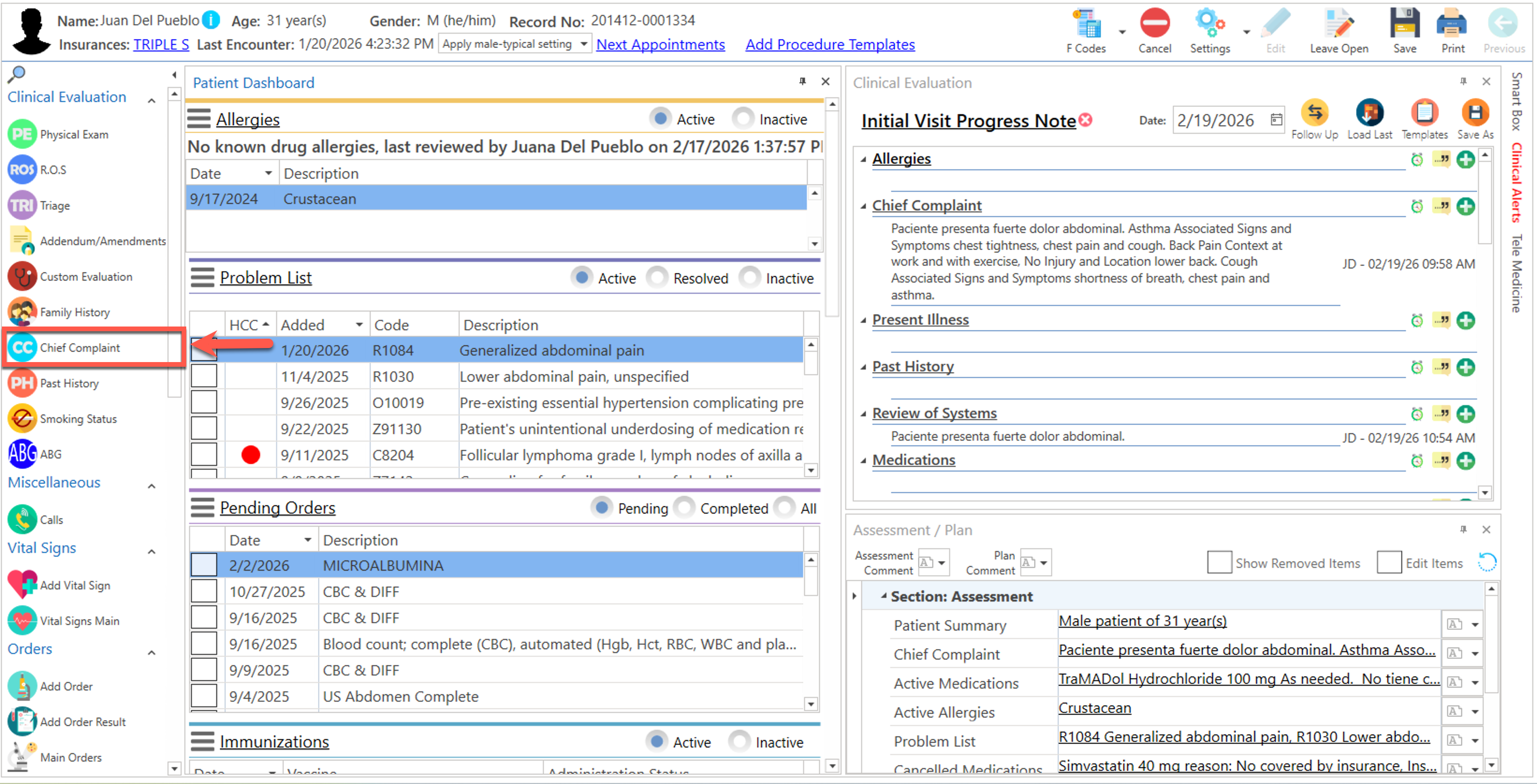 - Presione el botón de "Chief Complaint", localizado en la sección del "Side Bar".