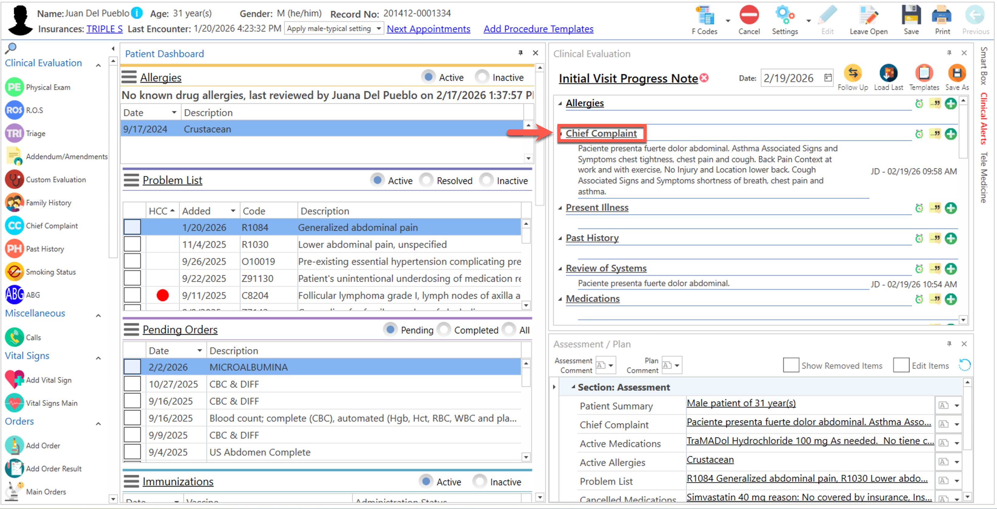 - Presione sobre el enlace de "Chief Complaint", localizado en la sección de "Clinical Evaluation".