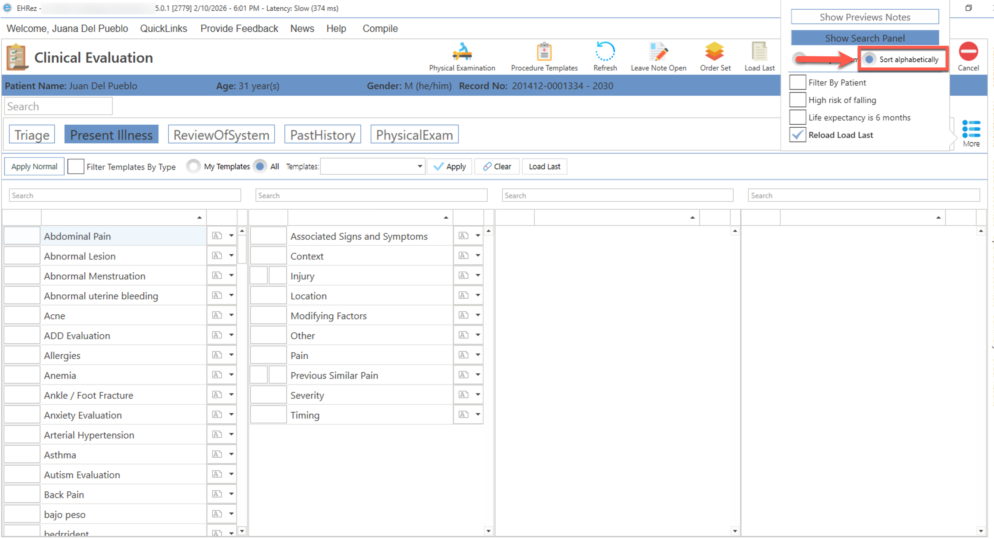 - En la primera columna que se despliega en la pestaña de "Present Illness", presione el botón derecho del "mouse".