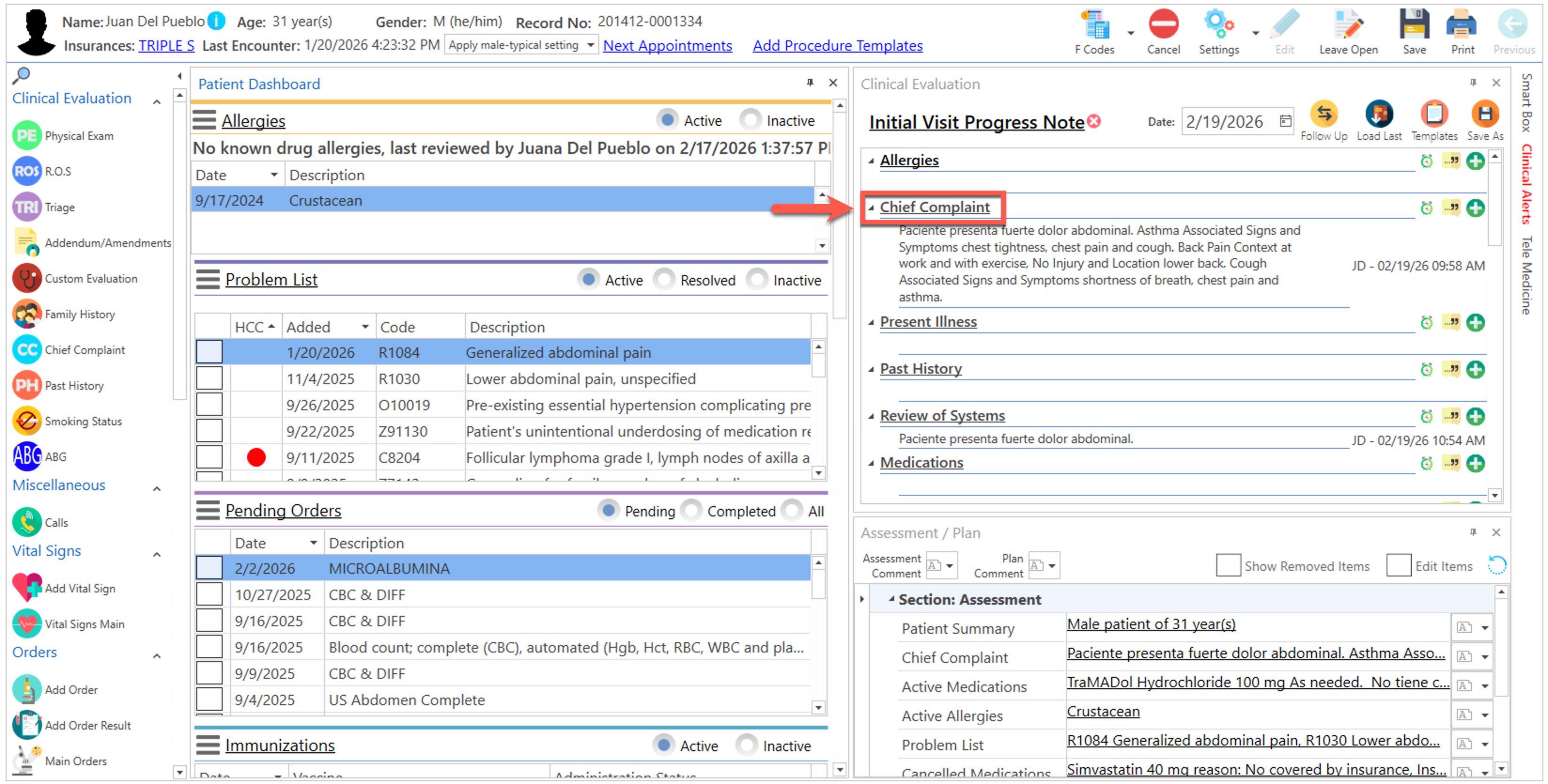 - Presione sobre el enlace de "Chief Complaint", localizado en la sección de "Clinical Evaluation".