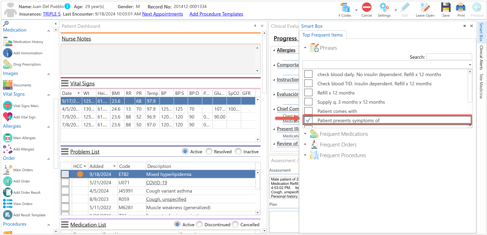 - Seleccione la frase favorita, que desea agregar a la evaluación clínica.