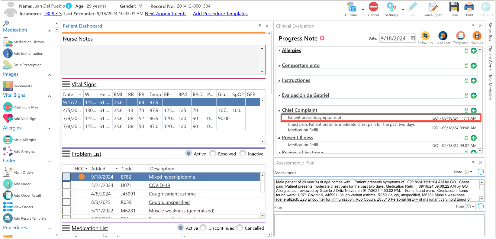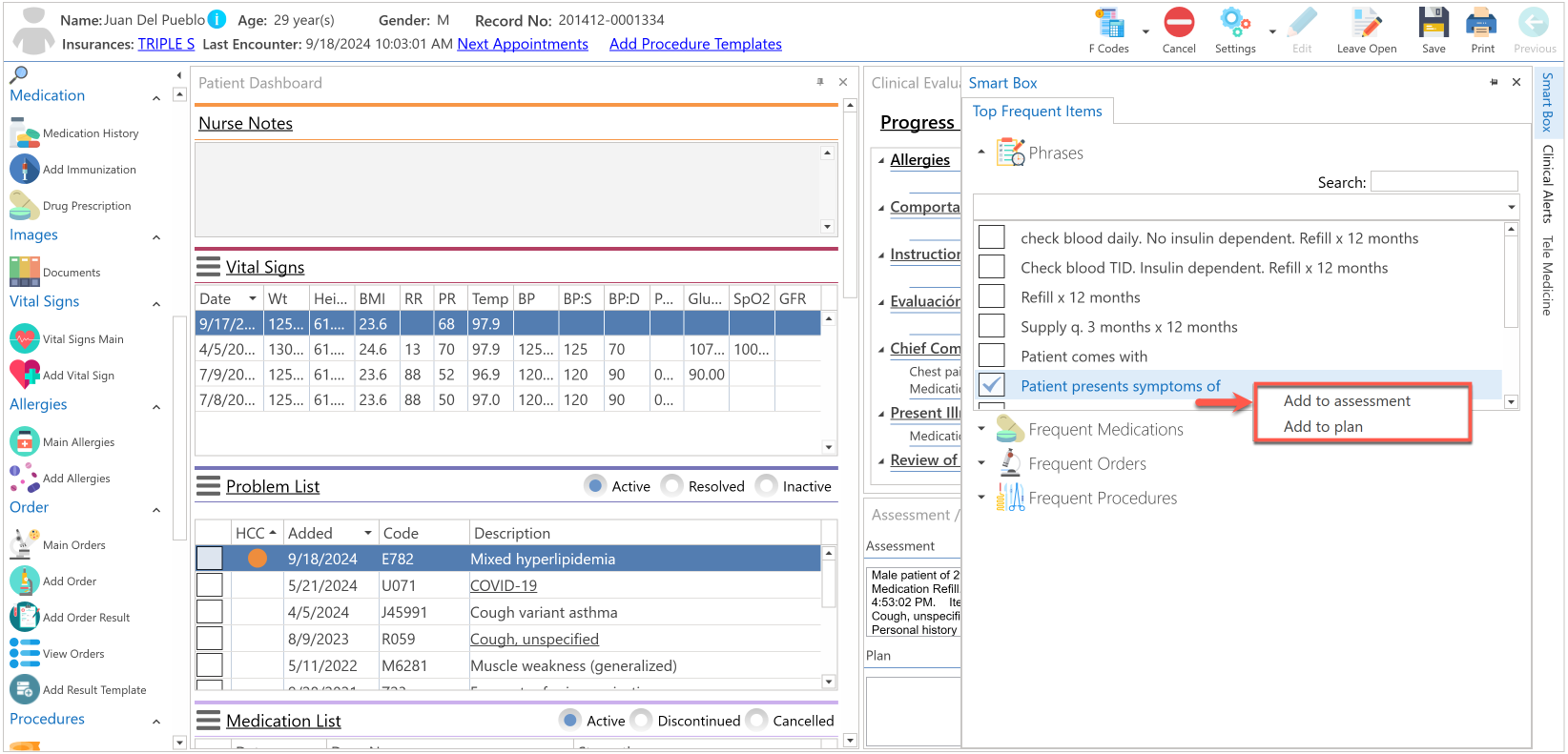 - Presionando el botón derecho del "mouse", sobre la frase seleccionada, y escoger si desea agregarlo a la sección del "Assessment" o del "Plan".