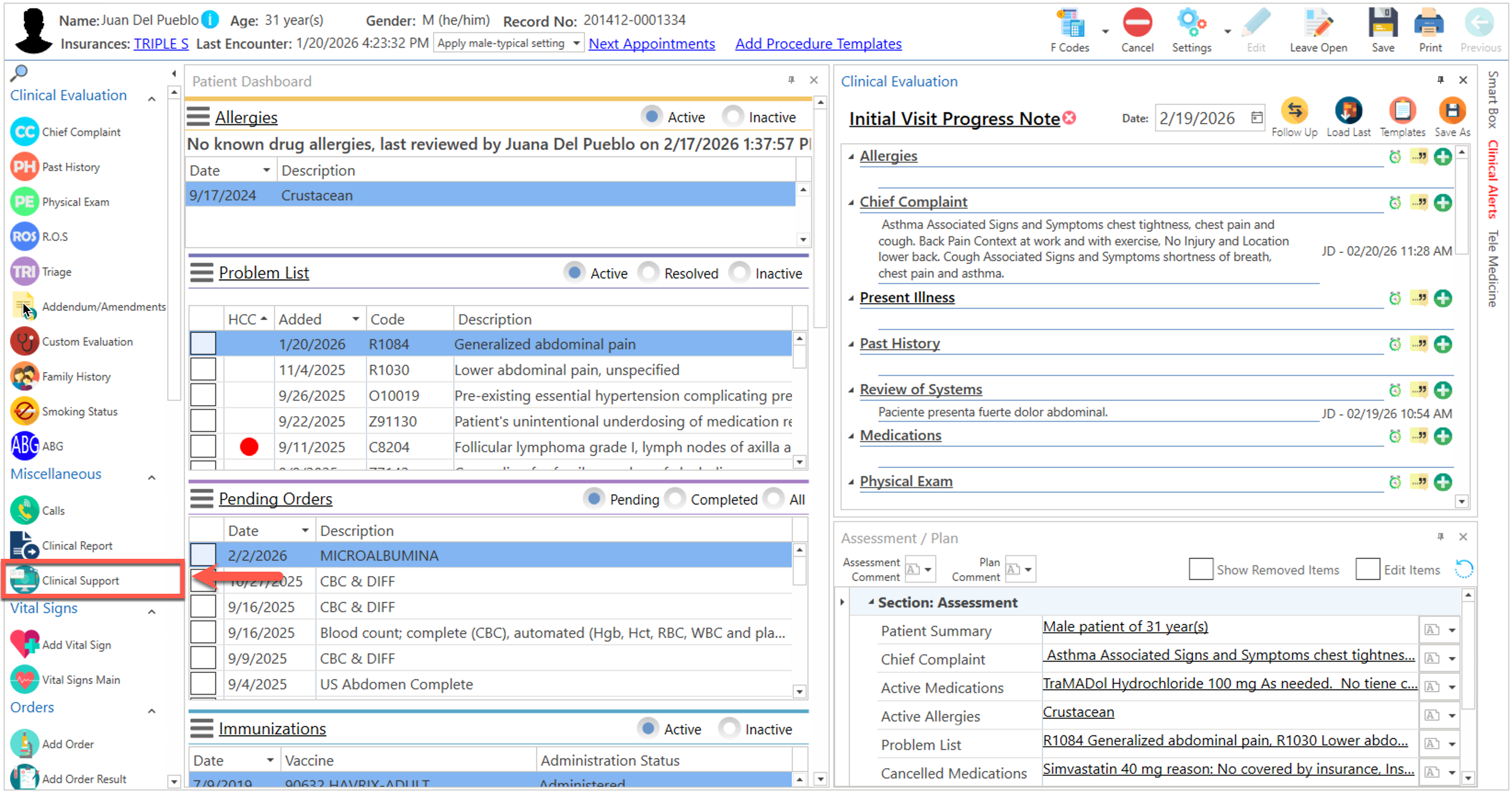 - Presione el botón de "Clinical Support", localizado en la sección del "Side Bar".