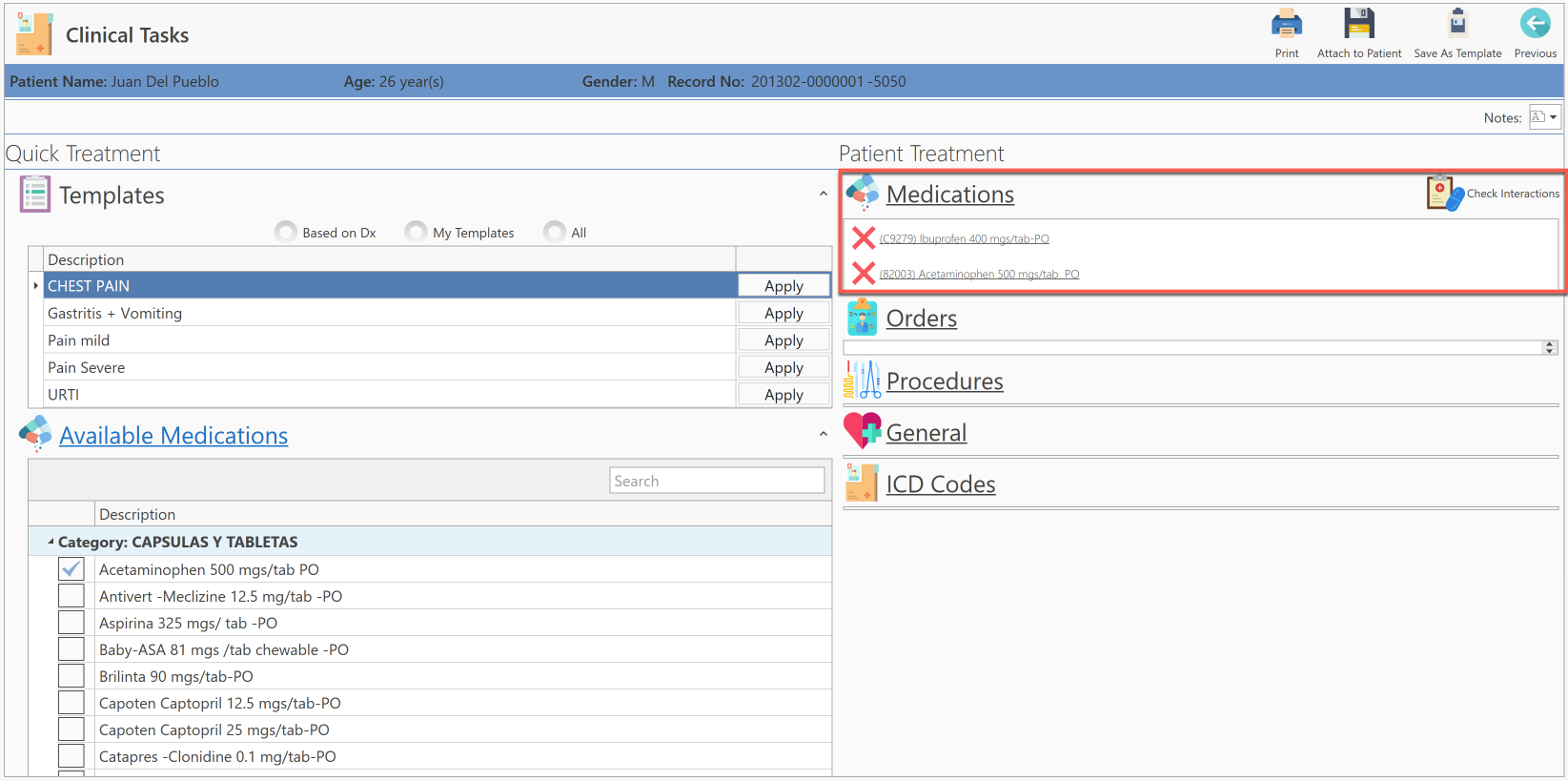 - Medications: En esta sección, se desplegarán los medicamentos seleccionados, para administrar al paciente. Los mismos, pueden ser removidos.