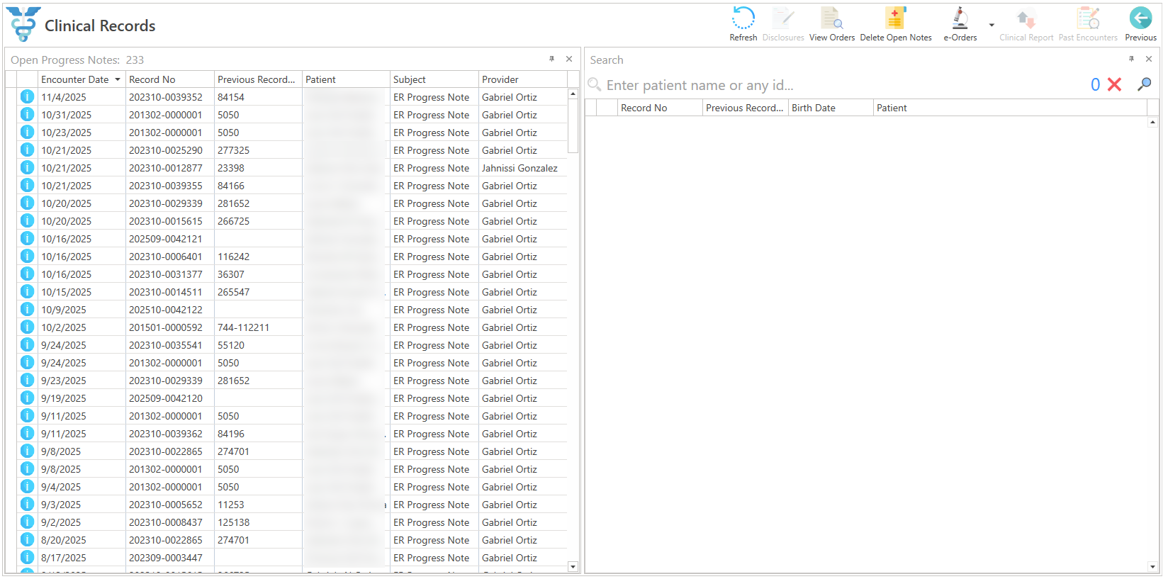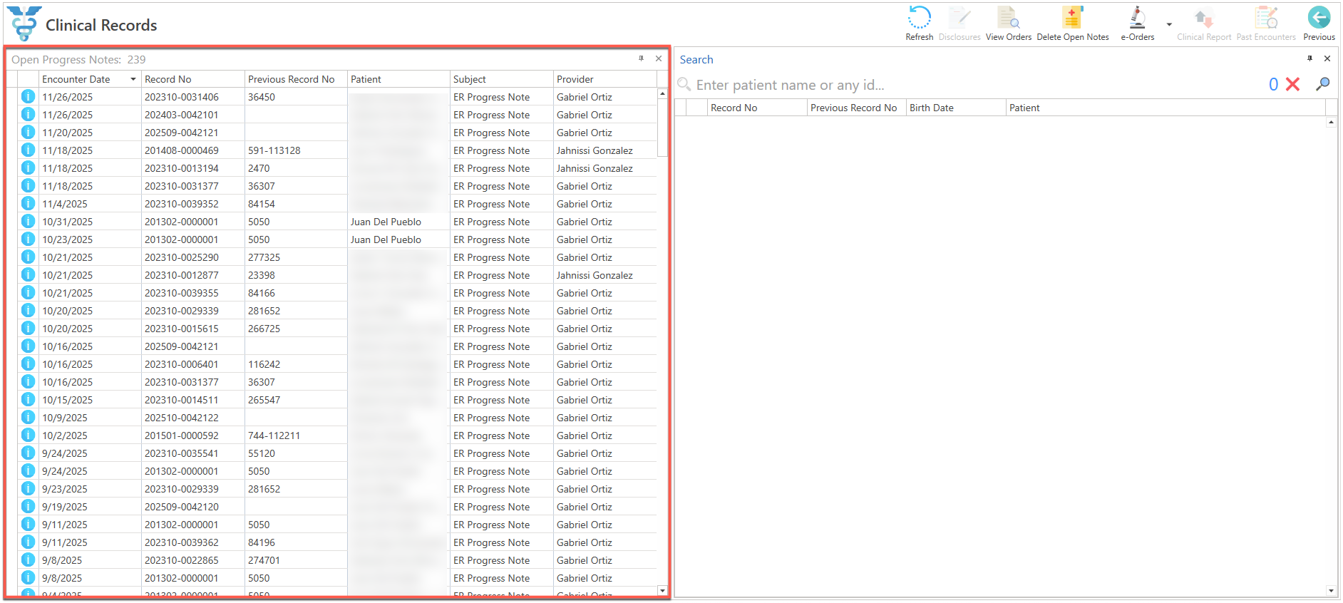 - Open Progress Notes: Despliega el listado de pacientes, con notas de progreso abiertas e incompletas.