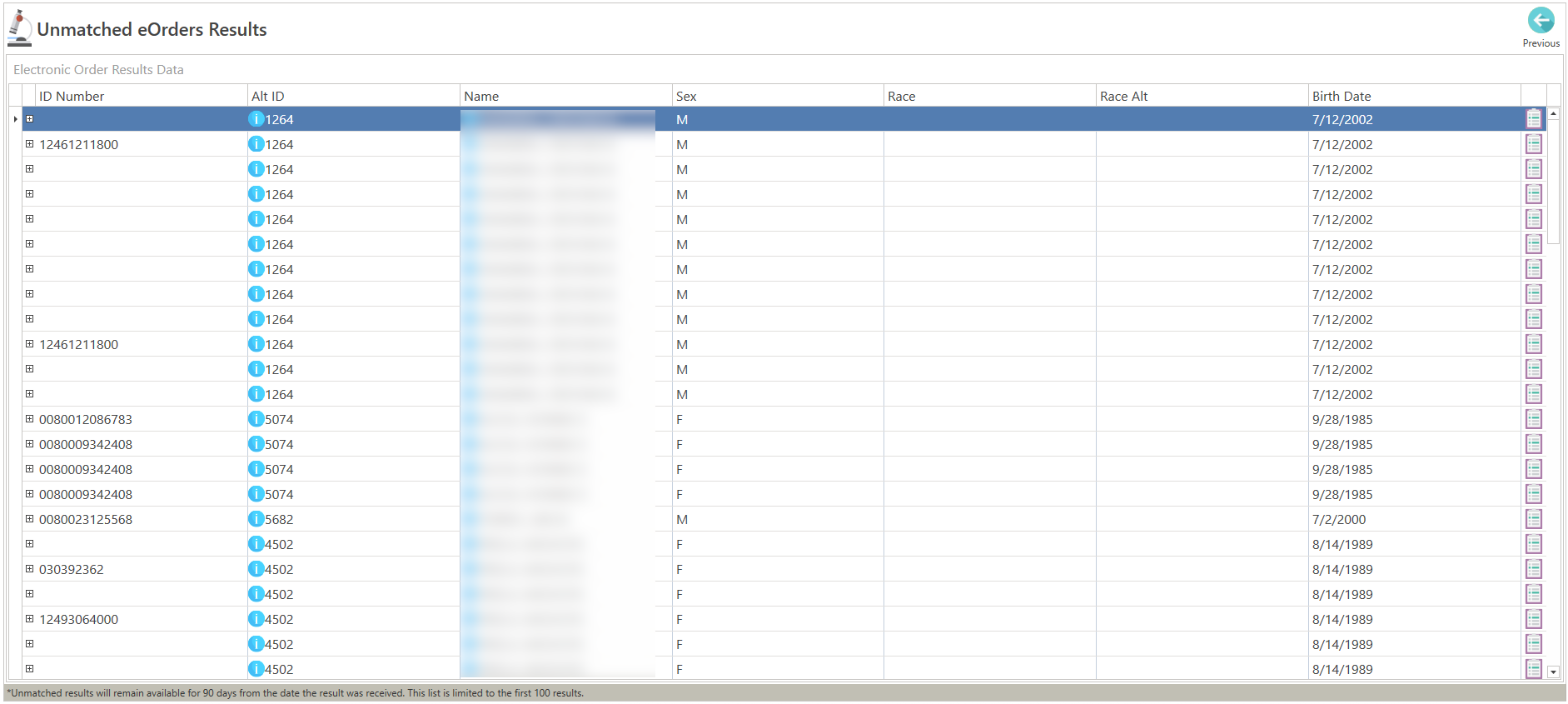 - e-Orders: Manejo de los laboratorios electrónicos. Al presionar, se desplegará la pantalla de "Unmatched e-Lab Results". (Los resultados solo permanecerán, por un periodo de 90 días, a partir de la fecha en la que fueron recibidos.)