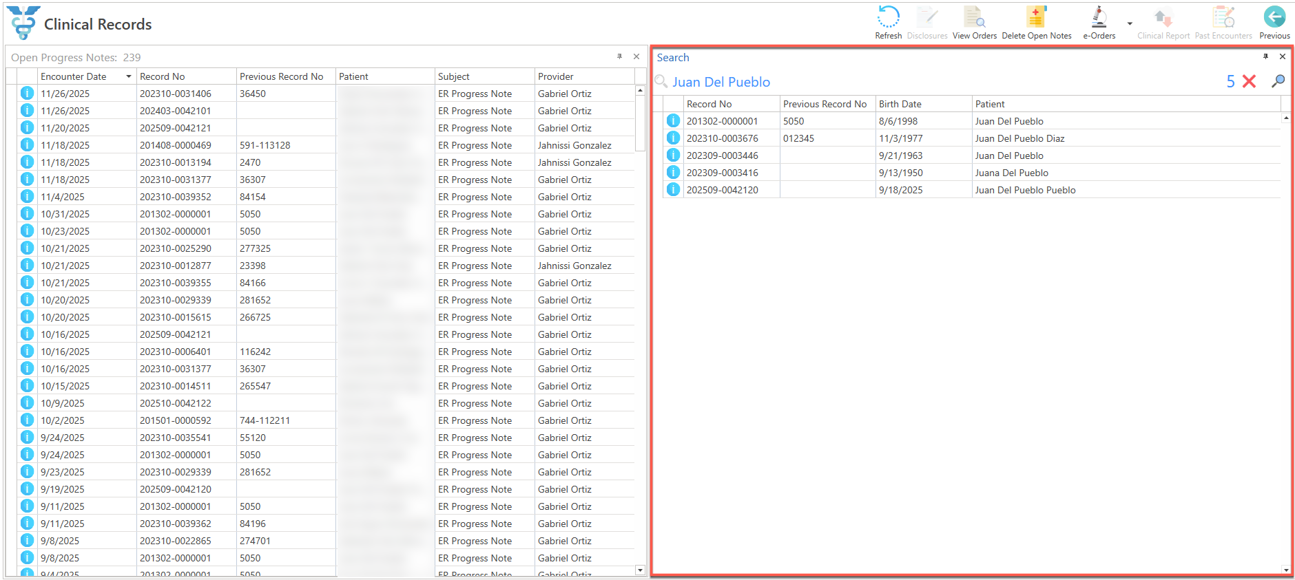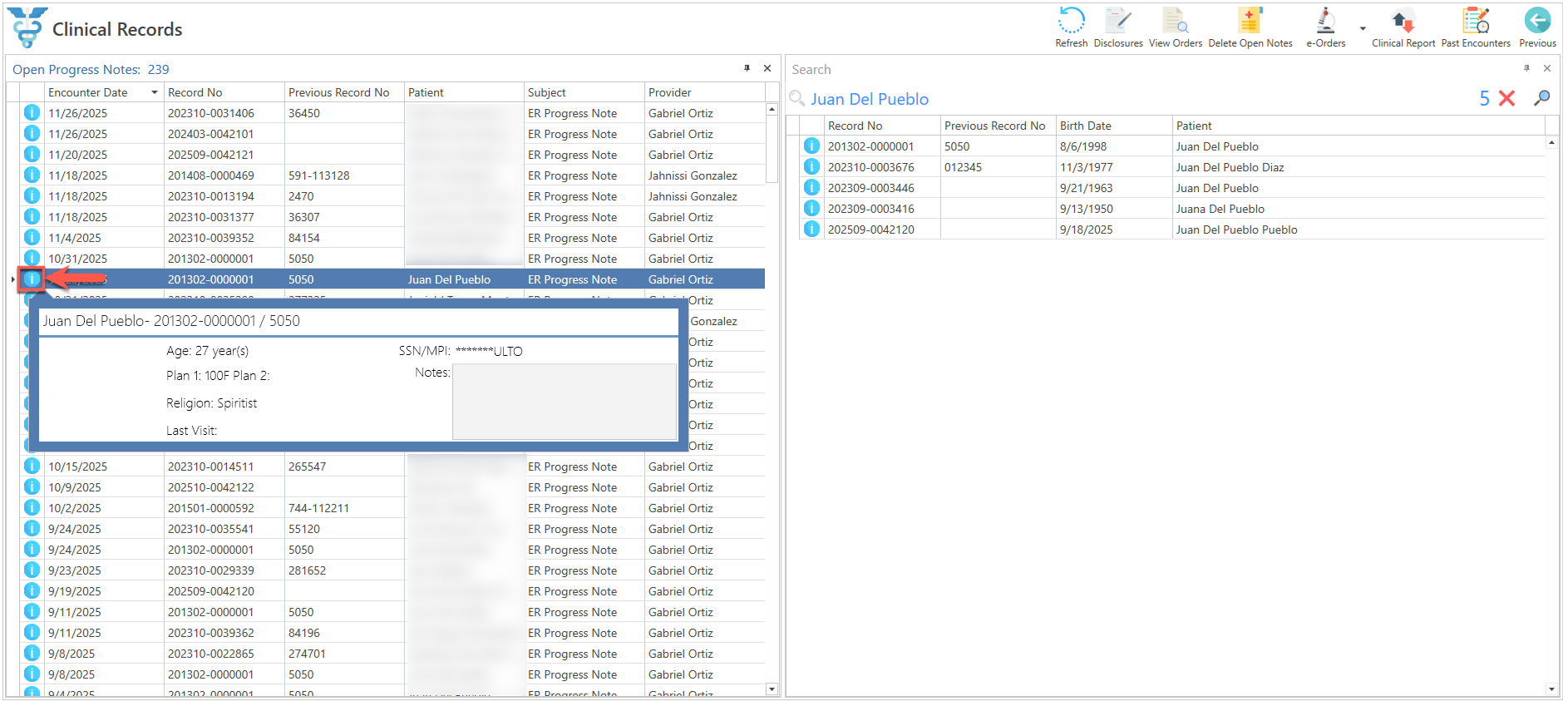 - Nota: Si desea ver, si el paciente tiene una o más notas abiertas, seleccione el paciente y presione el botón de "Past Encounters", localizado en la parte superior de la pantalla o, presione el botón derecho "mouse" y seleccione la poción de "Check for Open Notes". La pantalla de "Past Encounters", se desplegará automáticamente, al momento de seleccionar un paciente.