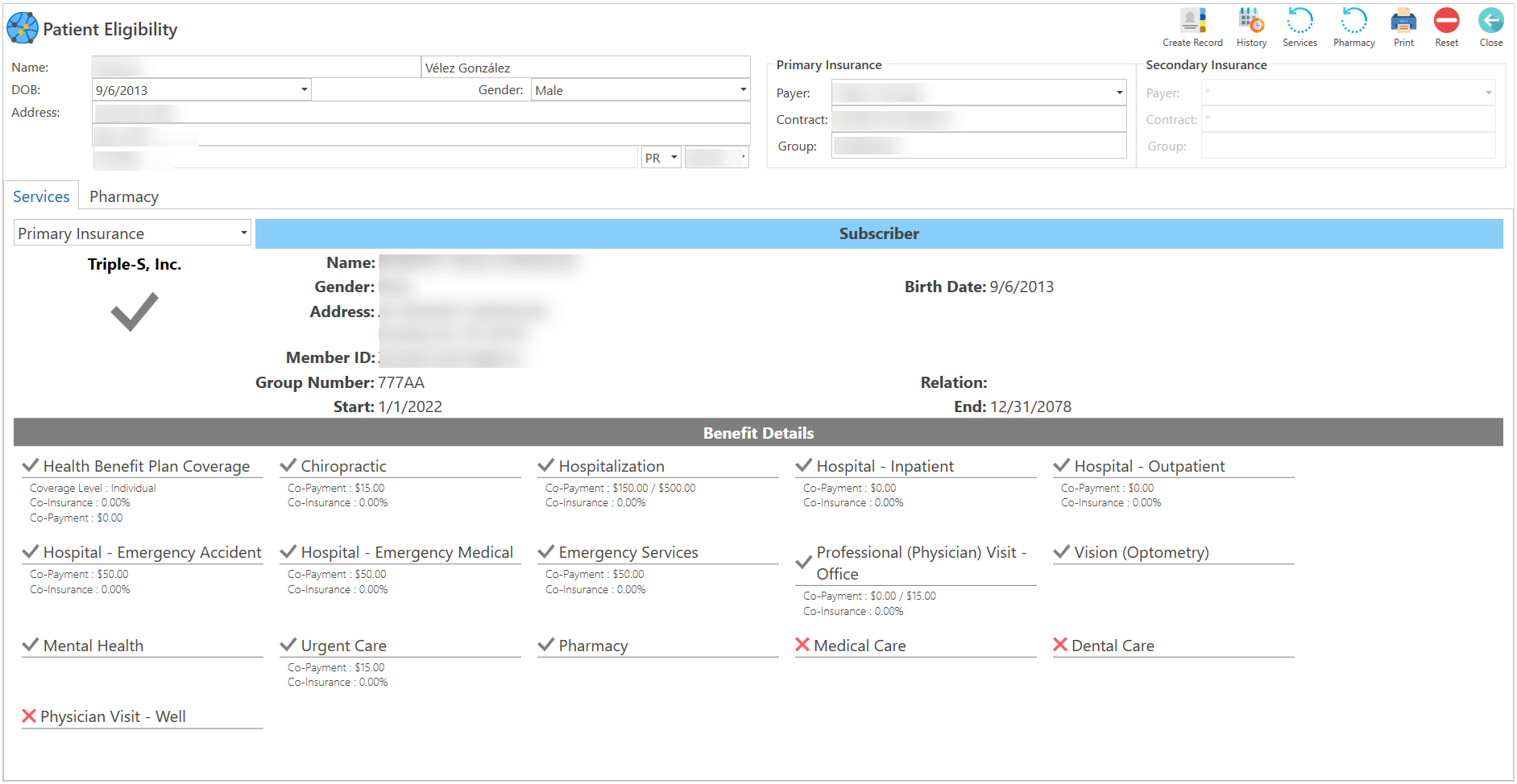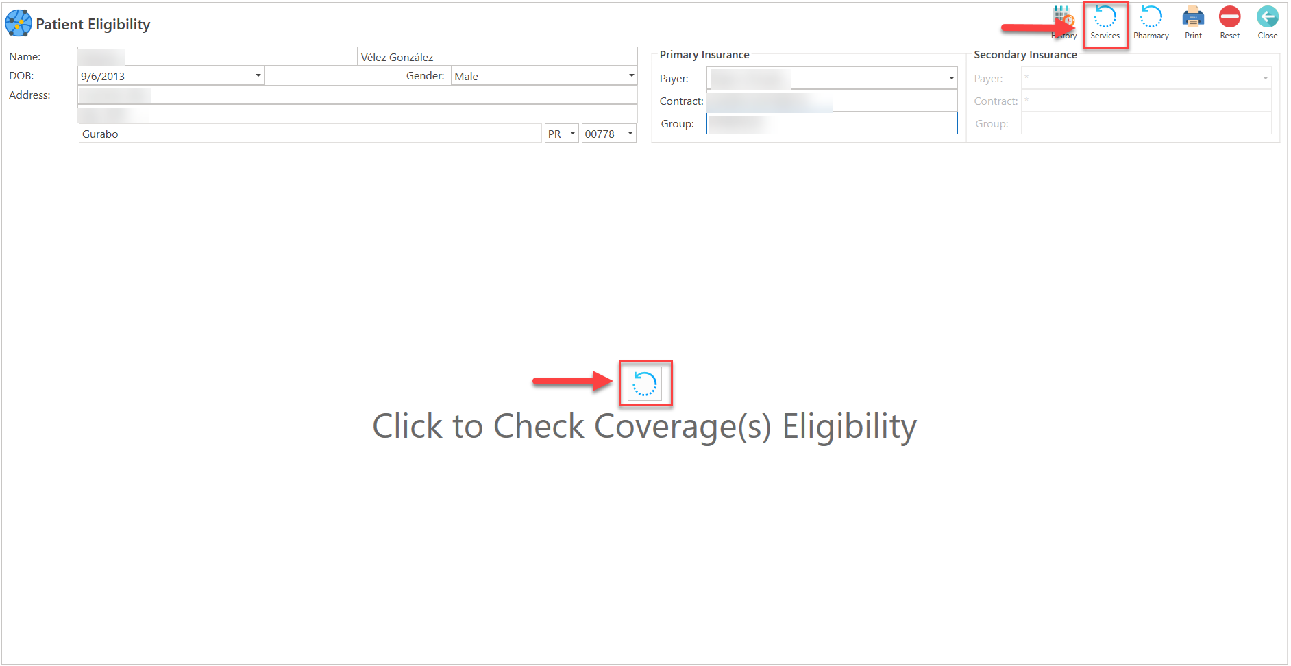- Una vez registrada la información, presione el botón de "Services", localizado en la parte superior de la pantalla o presione el botón de "Click to Check Coverage Eligibility", localizado en el centro de la pantalla.