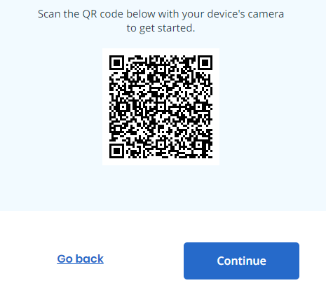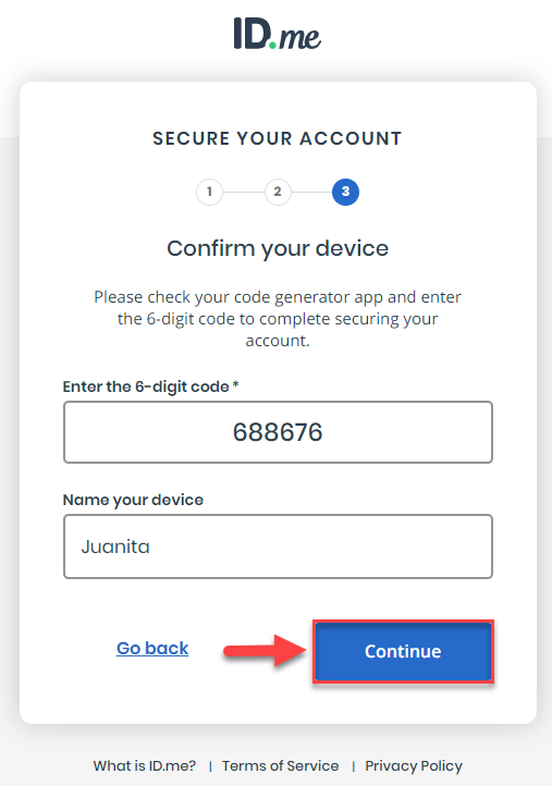 - Una vez haya escaneado el código, se desplegará la siguiente pantalla. Luego, identifique su dispositivo y presione el botón de "Continue". (Nota: Debe presionar el botón de "Continue", al instante, ya que el código cambia constantemente. De ser así, registre el que muestra en la aplicación de su teléfono inteligente, al momento.)
