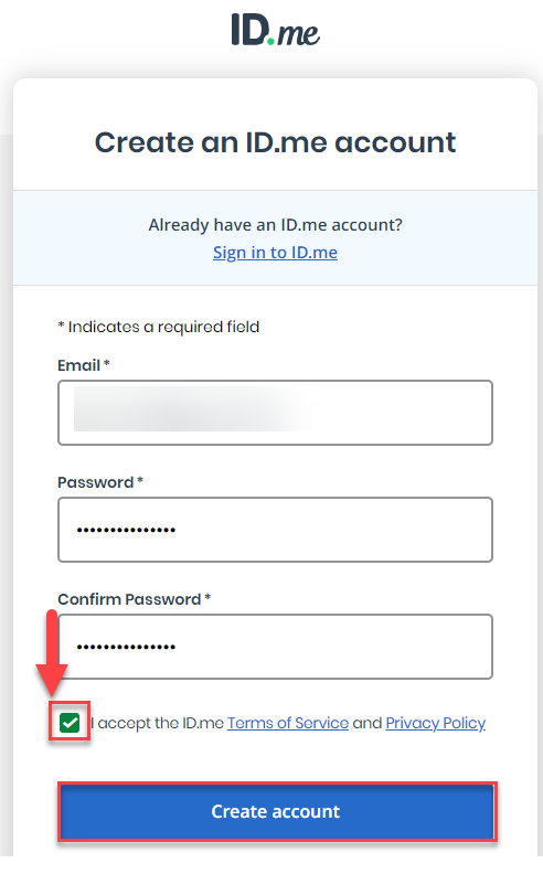 - Registre su correo electrónico, contraseña y confirmación de la misma. Una vez haya completado de registrar la información, seleccione el encasillado de "I accept the ID.me Terms of Service and Privacy Policy" y luego, presione el botón de "Create account".