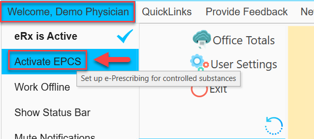 Desde el menú principal, en "EHRez" haga clic,m sobre la etiqueta "Welcome", localizada en la parte superior izquierda de la pantalla, y seleccione la alternativa "Activate EPCS".