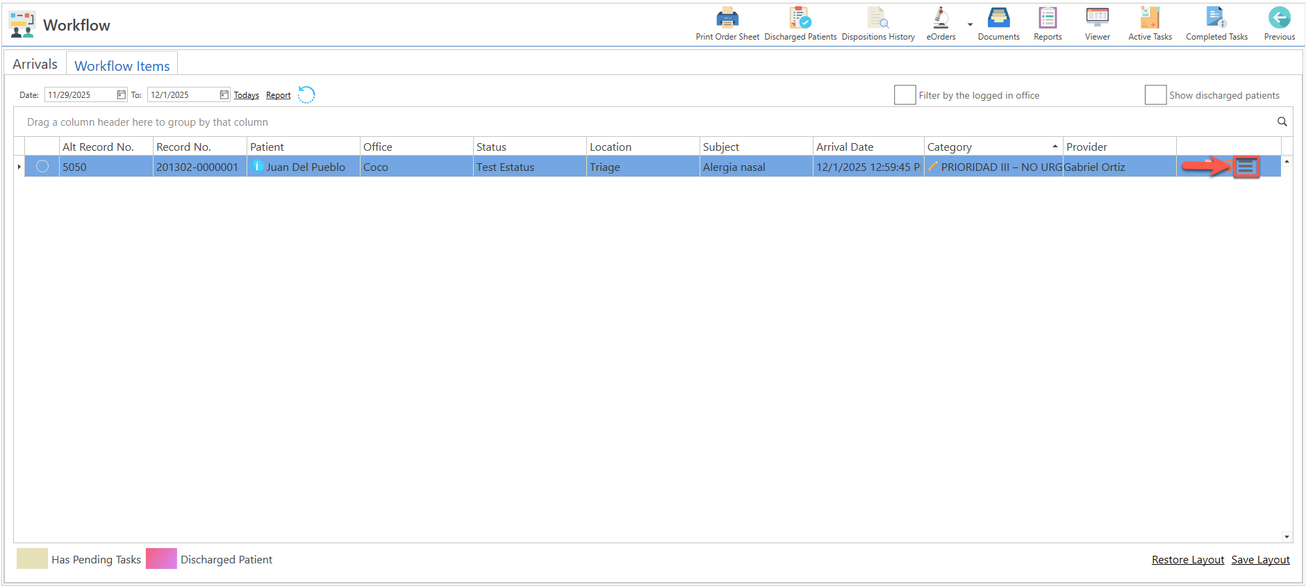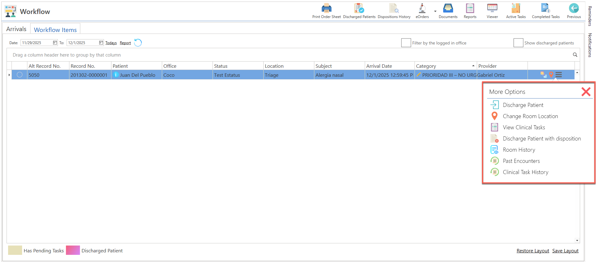 - En la pantalla de "Workflow Items", seleccione el paciente, que está identificado con tareas clínicas y presione el botón de "More Options".