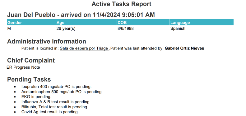 - Pending Tasks: Despliega el listado de las tareas clínicas del paciente.