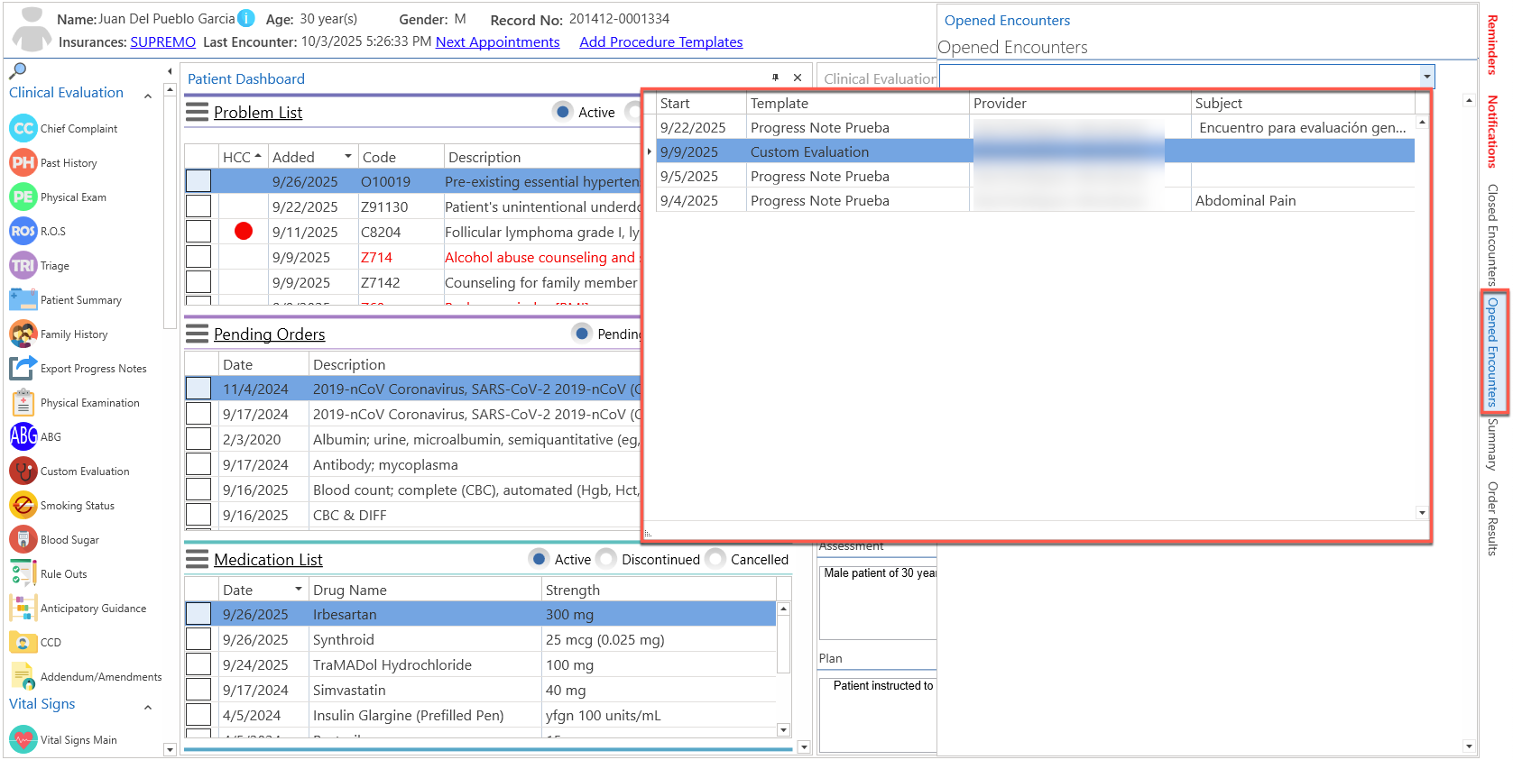 • Una vez el paciente es seleccionado, presione la pestaña de "Opened Encounters", localizada en la parte derecha de la pantalla.
